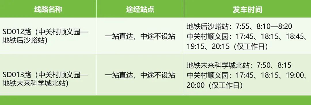 新开通的SD012路(中关村顺义园—地铁后沙峪站)、SD013路(中关村顺义园—地铁未来科学城北)两条直达专线,可方便中关村顺义园企业员工上下班,快速接驳地铁15号线、地铁17号线。