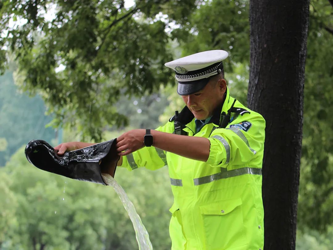 路况平稳后,交通民警于江龙走到路旁倒出雨靴中的积水。