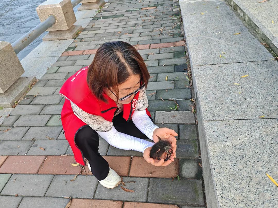 光明街道裕龙三区党总支书记龚凤娟巡查潮白河时救助国家“三有”保护动物白骨顶。