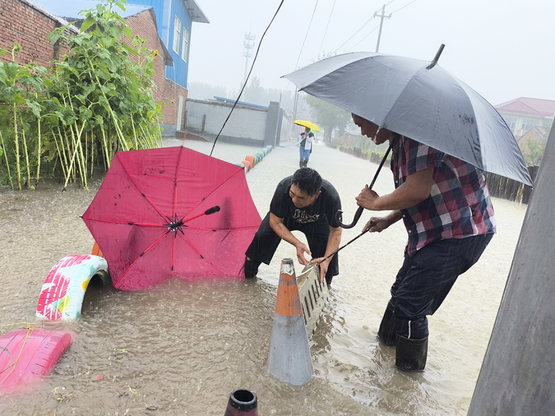 木林镇工作人员与包村干部巡查村内街道排水、河道水位情况。