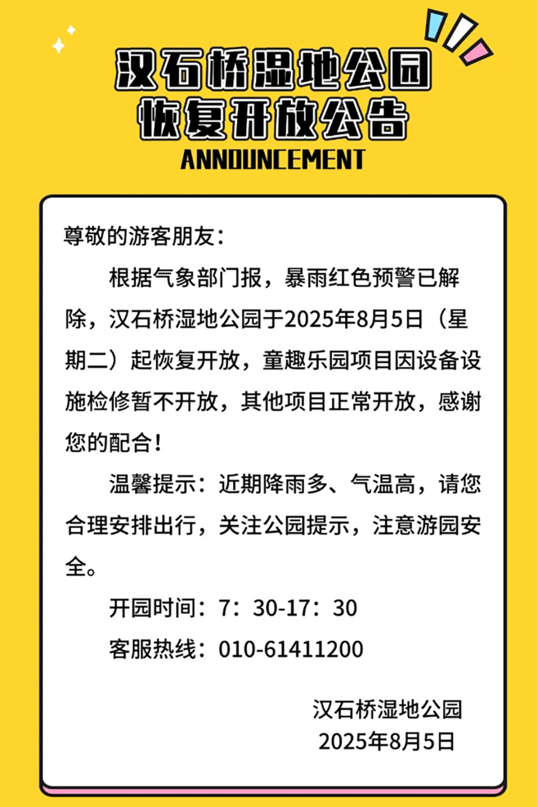 虽然部分区域已恢复开放,但近期降雨频繁,市民出游前务必密切关注天气变化和景区开放信息,合理规划行程。游玩过程中,遵守景区安全规定,远离河道、山体等危险区域,切勿前往未开发或关闭的区域。如遇突发天气变化,要立即寻找安全地带避险。