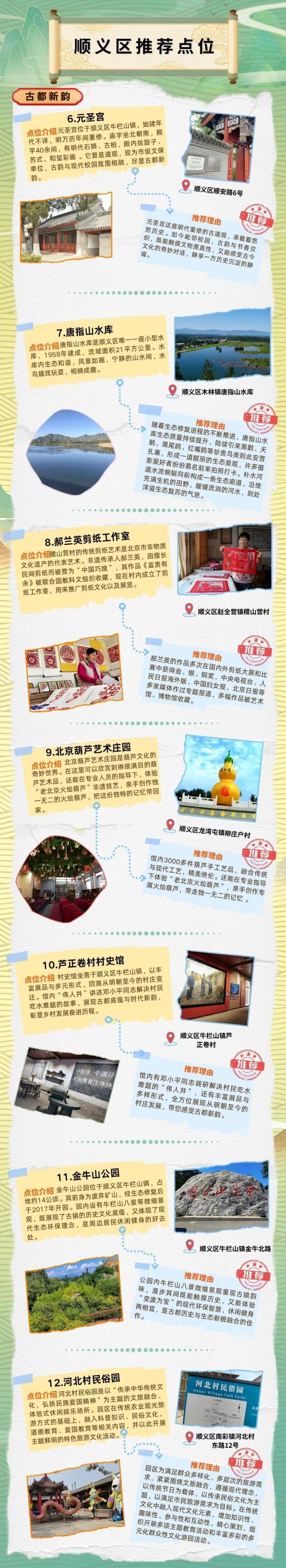 顺义,藏着京味儿地道的打开方式!钻进焦庄户的“地下长城”触摸烽火岁月,在牛栏山酒香里品读酿造传奇;漫步汉石桥湿地,看鸥鹭翔集,感受都市绿肺的呼吸;走进非遗工坊,景泰蓝的华光映照火绘葫芦的趣味,唤醒指尖上的老北京记忆。从张堪治水的廉政故事到重焕新颜的金牛山公园,从元圣宫的悠悠古柏到龙府老县衙的时光印痕,顺义的古韵正以生态之美、匠心之魂、创意之光,织就一幅新时代画卷!来顺义,拍出你最in的古都新韵打卡指南。