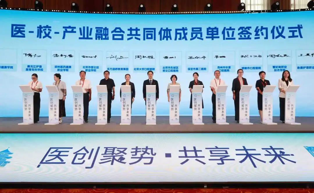 “北大口腔国际口腔医疗器械创新转化基地”合作企业入驻签约仪式同步举行。登拓新材料、欧世百泰、和福汇生物、中北医创等10家口腔领域优秀企业作为首批合作代表集中签约,标志着顺义区口腔医疗器械创新发展步入“快车道”。为打通临床需求、高校科研与产业转化之间的壁垒,北京大学口腔医院联合北京市东城区崇文口腔医院、东方剑桥教育集团、保定市第二医院等多家职业院校及医疗机构,共同签署“医-校-产业融合共同体”合作协议,该共同体由北大口腔牵头,致力于实现卫生职业教育与健康产业需求的有效衔接,为口腔医学乃至更广范围的医疗创新提供持续支撑。