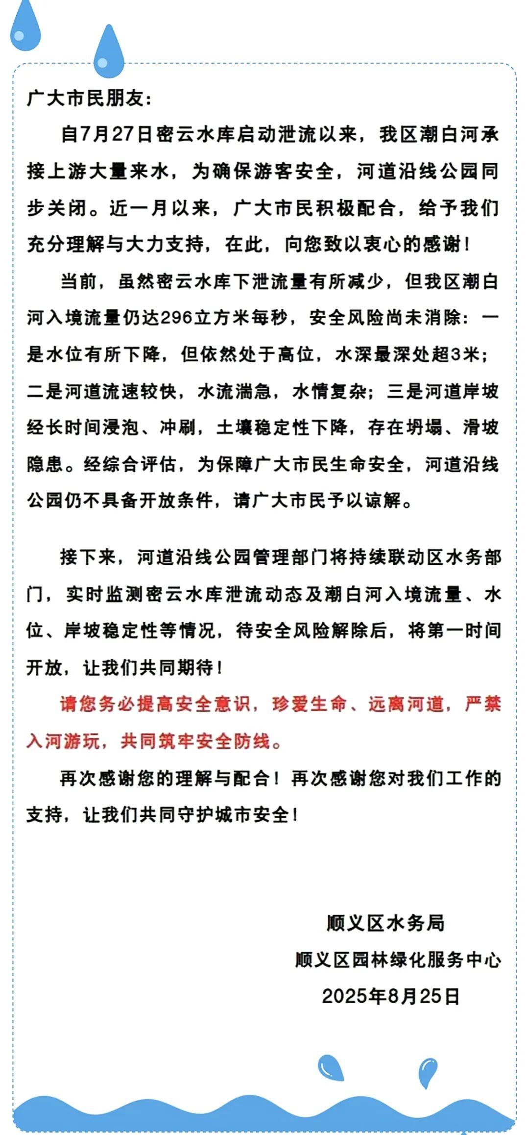 河道沿线公园管理部门将持续联动区水务部门,实时监测密云水库泄流及潮白河水位、岸坡稳定性等情况,待安全风险解除后将立即开放。在此提醒市民务必增强安全意识,远离河道,严禁入河游玩,感谢您的理解与配合。