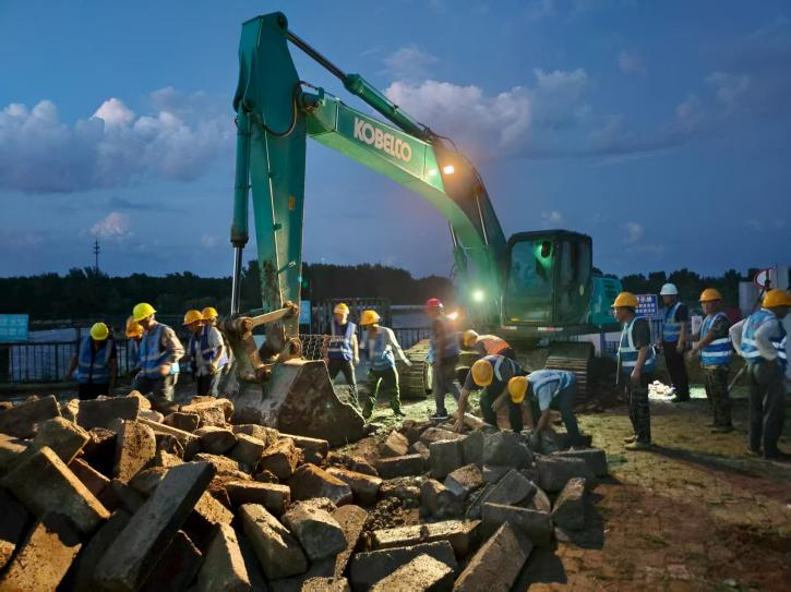 区水务局工程处党支部作为防汛抢险的“尖刀连”,始终冲锋在最危险的一线。因上游持续泄流,潮白河沮沟橡胶坝右堤岸坡等部分堤岸陆续出现不同程度损坏,工程处抢险队火速集结,累计出动147名队员、调配63台机械连夜投入紧急排险作业。工程处党支部书记张亚明冒雨现场指挥,队员们紧随其后,搬运铅丝石笼、铺设块石,迅速控制险情,有力保障河道安全。