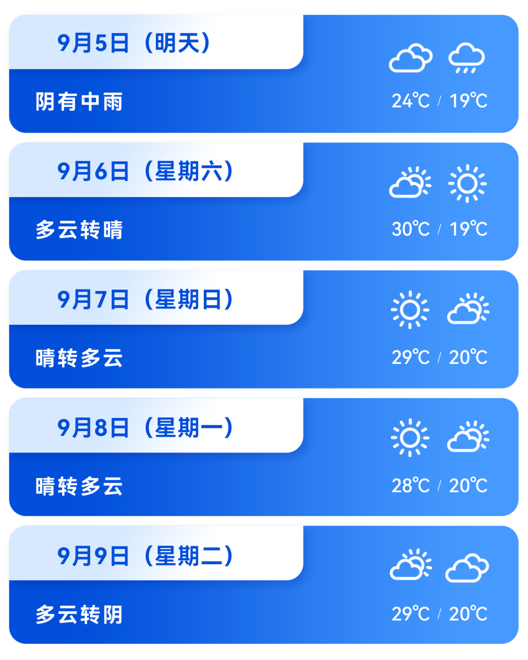 据区气象台消息,今天夜间多云转阴,有轻雾,偏南风1、2级,最低气温21℃。明天白天阴有中雨,偏南风2、3级,最高气温24℃,出行注意携带雨具。