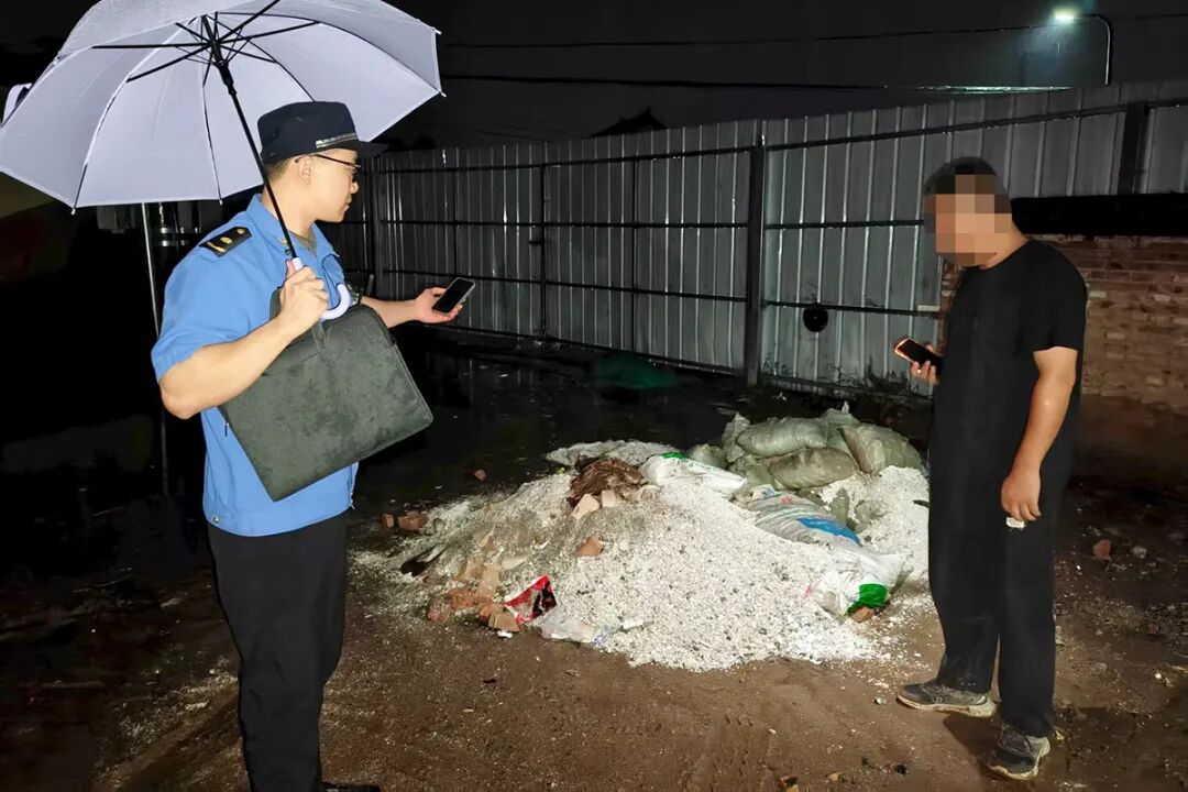 当日8时,北孙各庄村网格员在日常巡查中发现一处有装修垃圾被随意倾倒。了解情况后,村环境工作负责人立即调取了附近监控视频,锁定偷倒垃圾的车辆为白色京A牌照的面包车。工作人员通过监控分析车辆活动规律,预判这辆车可能会在夜间再次作案,网格员随即向镇综合行政执法队报告。接报后,执法人员迅速赶到现场进行布控,于19时30分成功拦截涉案车辆及当事人。执法人员现场完成取证,并依法开具执法文书,要求当事人配合调查。