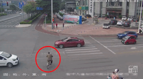 视频显示,一名女子骑自行车边转弯边横穿马路,与一辆慢速行驶的车辆发生碰撞,女子倒地受伤。