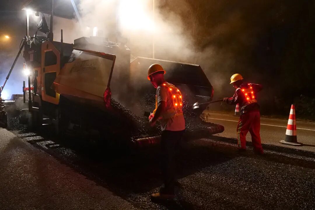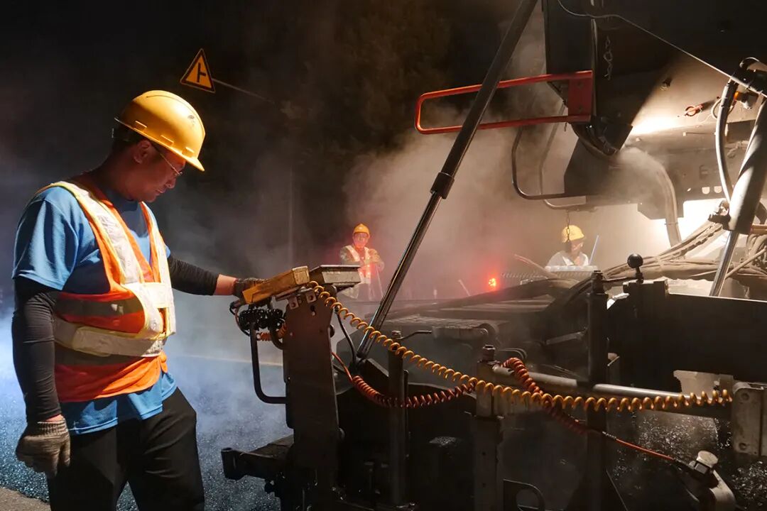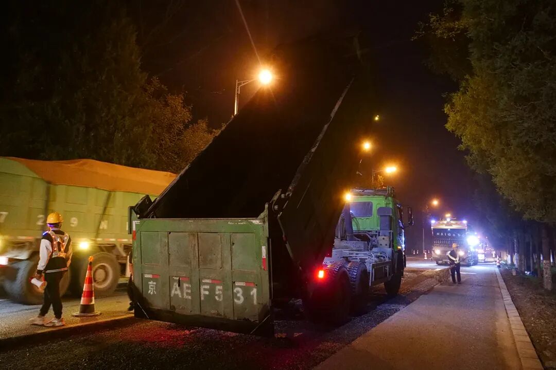 “现在进行的是道路沥青摊铺作业,施工路段交通流量较大,我们特意安排在夜间9点到次日凌晨5点施工,以避开白天通勤高峰,减少对市民的影响。”现场施工负责人李震手持对讲机,一边协调设备,一边向记者介绍。记者在现场看到,铣刨机缓缓推进,破碎的旧沥青被及时装车运走,一旁的洒水车同步作业,有效抑制扬尘。“次日早6点前,我们会把施工废料清理干净,洒水降尘,保证早高峰时导行路整洁通畅。”李震说。
