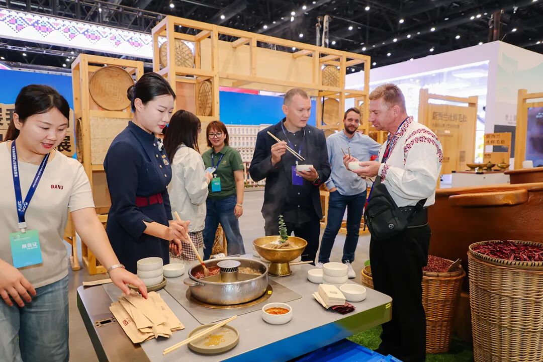 巴奴毛肚火锅食材展区人气十足,精选来自河南温县铁棍山药、广西荔浦芋头和陕西柞水木耳等特色产品作为火锅原料。现场特别设置沉浸式火锅品鉴区,现场涮煮特色毛肚,香气四溢,吸引了众多中外参展嘉宾与观众品尝、体验。