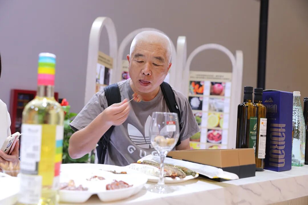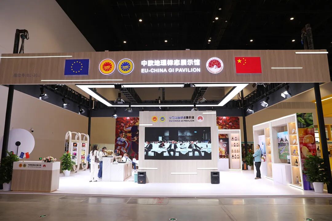 中欧地理标志展区汇聚了中国和欧盟国家优质地理标志产品,包含宁夏贺威酒庄葡萄酒、云南古树茶等特色产品,吸引市民驻足品尝。