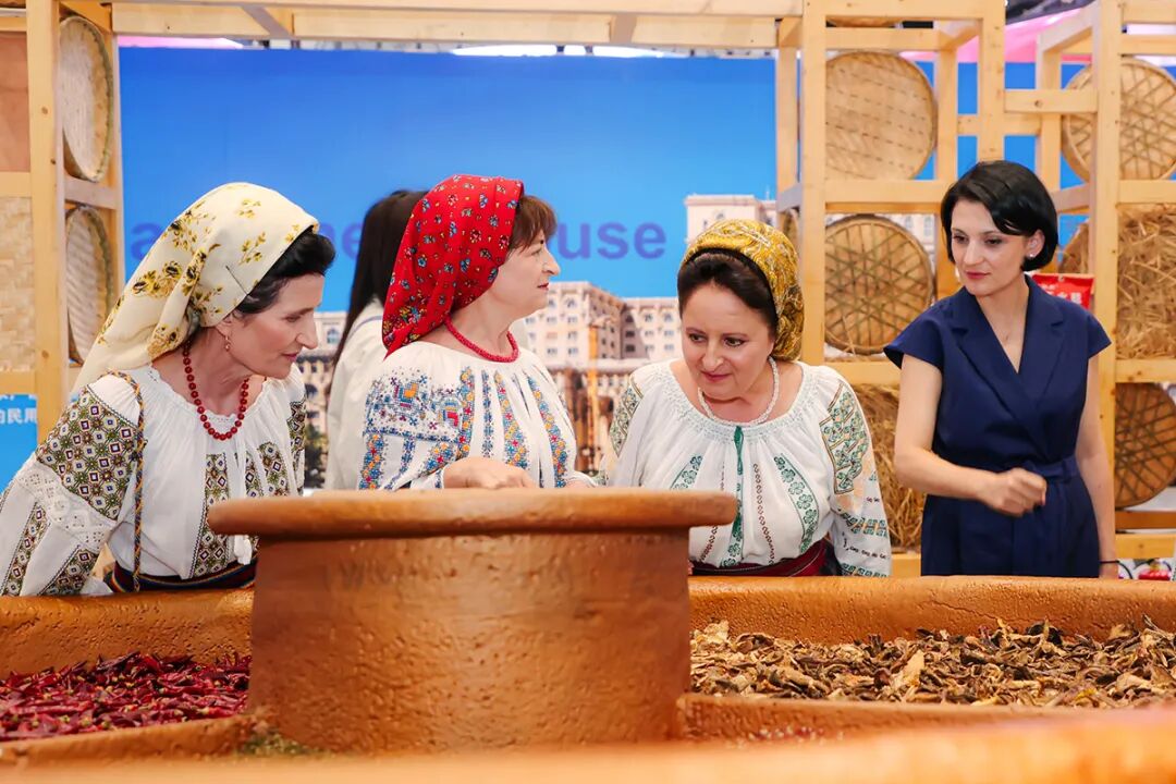 走进主宾国罗马尼亚展区,带有民族特色的罗马尼亚歌舞表演精彩上演,展区内特色锡比乌Telemea sibiu羊奶奶酪、Gitana Winery葡萄酒等产品琳琅满目。“我们带来了14种地理标志产品,包含葡萄酒、香肠、李子酱、面食类产品等,非常丰富,都是我们国家的特色产品,欢迎大家前来品尝。”罗马尼亚驻华大使馆二等秘书卡特林·西罗普表示。