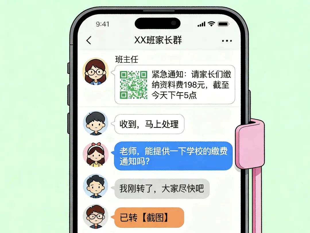 诈骗分子潜入班级群后,会仔细观察老师发言习惯及群内聊天规律,随后冒充老师,使用相同的头像和昵称。接着,他们发布虚假缴费通知,附上付款链接或二维码,诱骗家长或学生转账,从而实施诈骗。