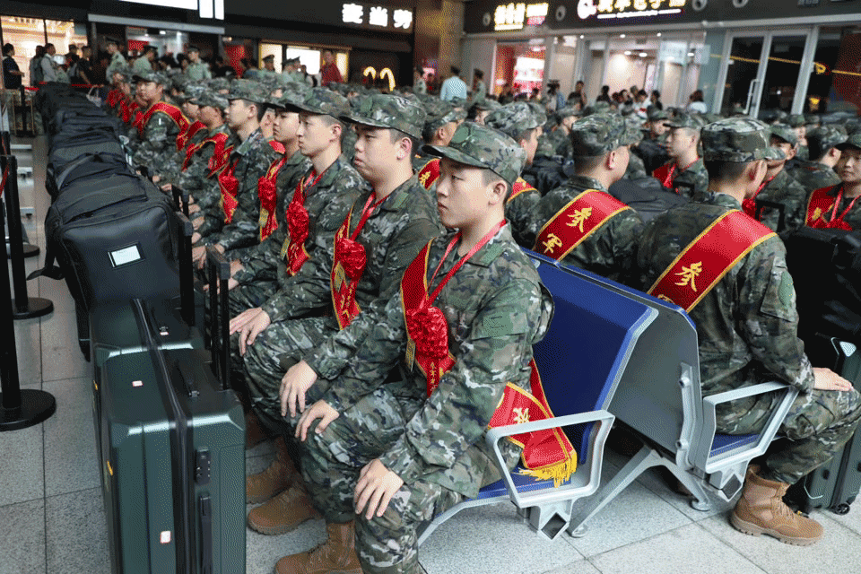 记者在北京南站候车大厅看到,车站为入伍新兵设置了专用候车区。“吃口家乡味,到了部队好好干。”前来送行的新兵亲友早早在此等候,边说着边将热气腾腾的饺子递上。新兵们与亲友合影留念,将挺拔身姿定格在照片里,他们眼中虽有不舍,却更藏着坚毅与担当。