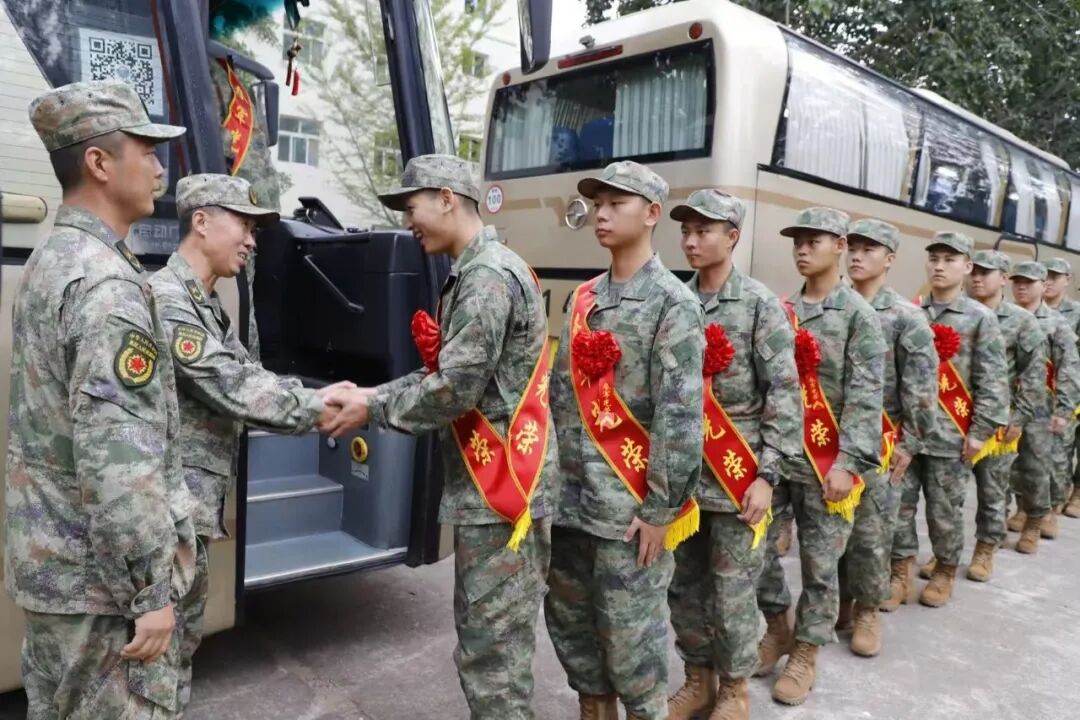 “踏过从戎门,携志赴军营。”9月22日清晨,身着戎装、胸佩红花的新兵们整齐列队,目光坚定、昂首挺胸走过从戎门,登上转运车辆。