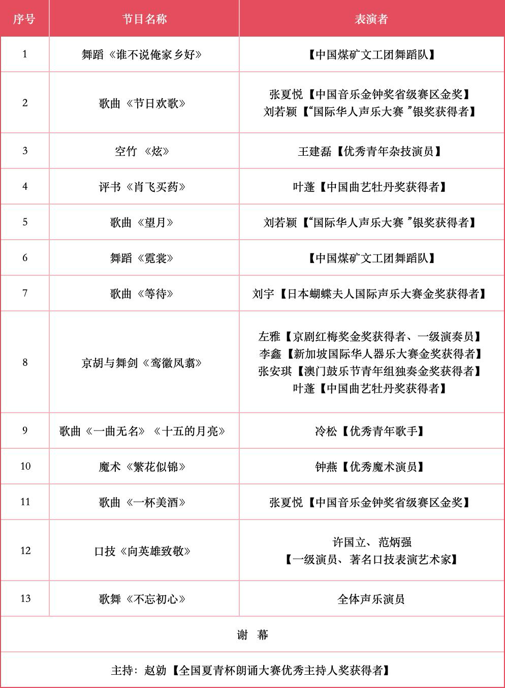 本次晚会演出阵容强大,特邀中国煤矿文工团倾力加盟,汇聚众多荣获中国音乐金钟奖省级赛区金奖、中国曲艺牡丹奖等大奖的艺术家,专业水准拉满。