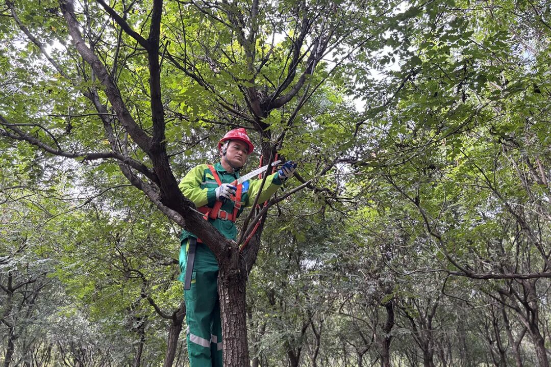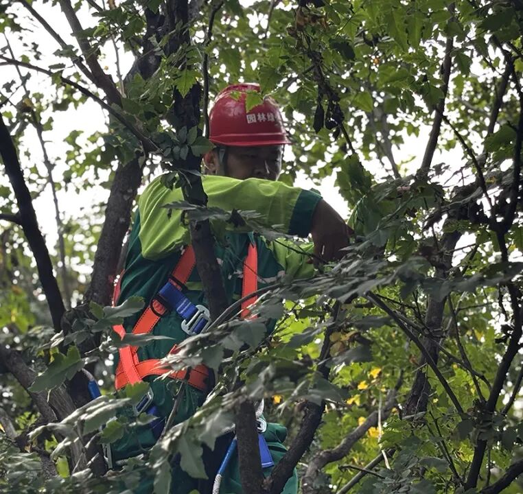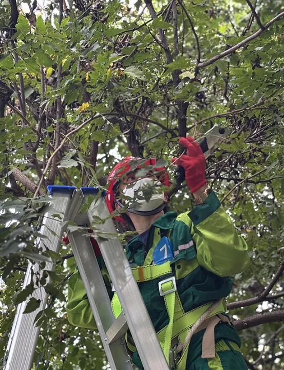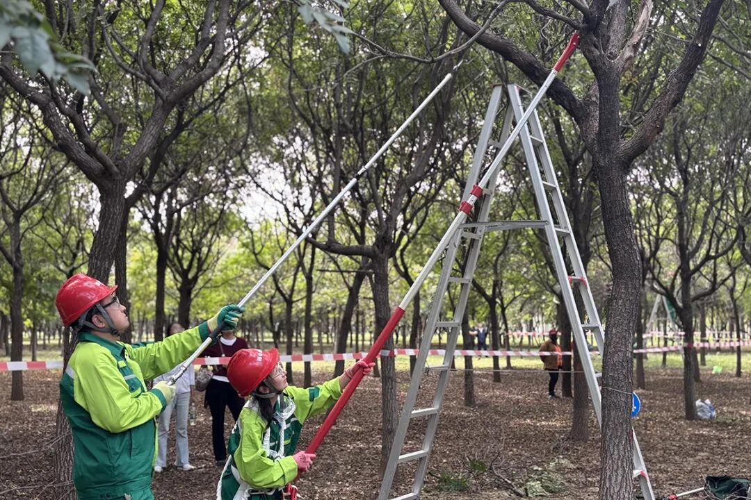 在牛栏山生态漫行步道的实操现场,栾树与海棠树成为选手们展示技艺的“模特”。他们登上梯子伸手推开枝叶,手持高枝锯,精准落刀,随后涂抹愈合剂,给树木贴上“创可贴”。一系列操作行云流水,与助手默契配合。大家严格按照“知树性、看树势、巧下剪、轻取枝、细处理、勤保护”的“六步修剪法”,整个过程既显专业功底,又藏匠心细节。