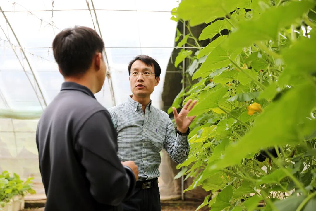 区供销社工作人员与农场负责人交流农作物生长情况。