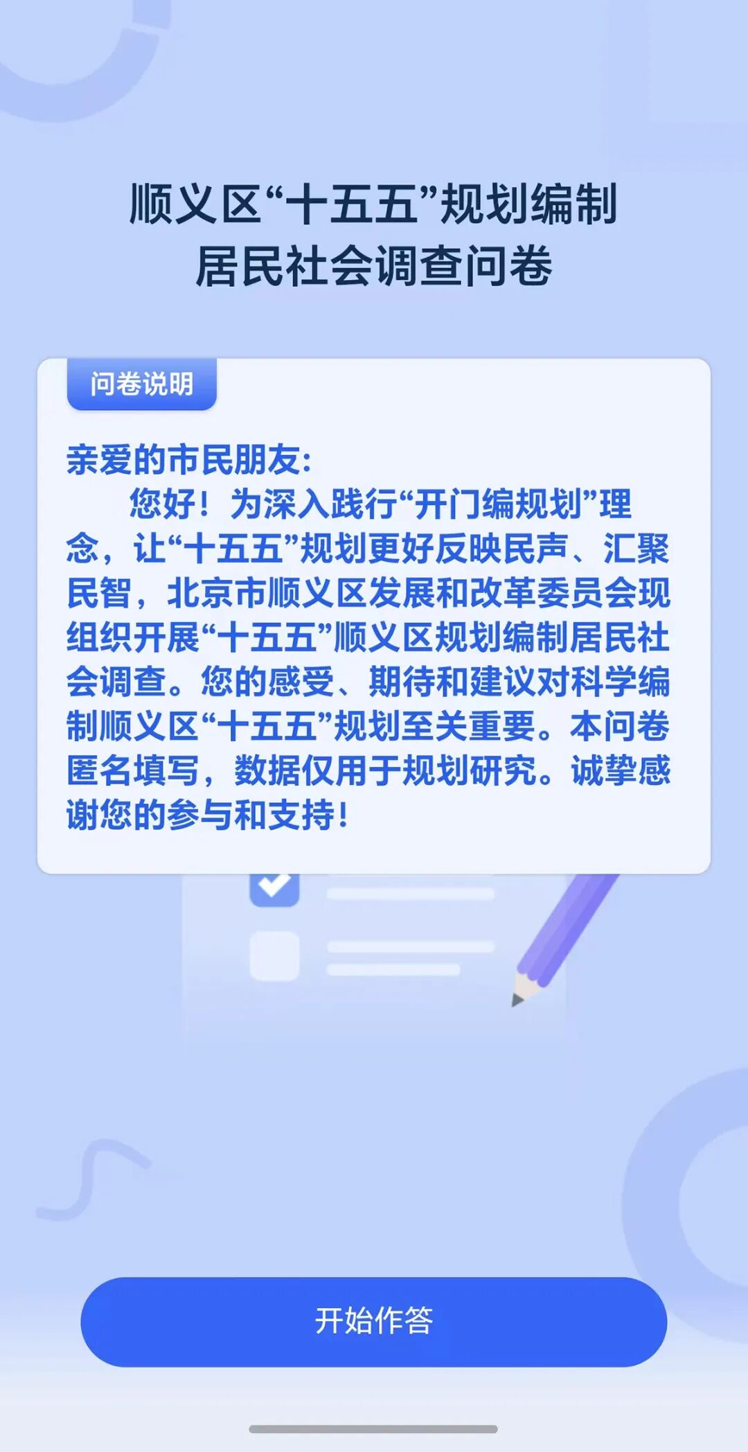 当前,顺义区“十五五”规划研究编制正在进行。顺义区深入贯彻习近平总书记关于“十五五”规划编制的重要指示精神,落实“科学决策、民主决策、依法决策”要求,坚持“开门编规划”理念,让未来五年的顺义更对百姓“胃口”,特开展顺义区“十五五”居民社会调查,诚邀您用几分钟时间,说说心里话、提提好建议。