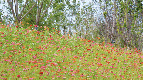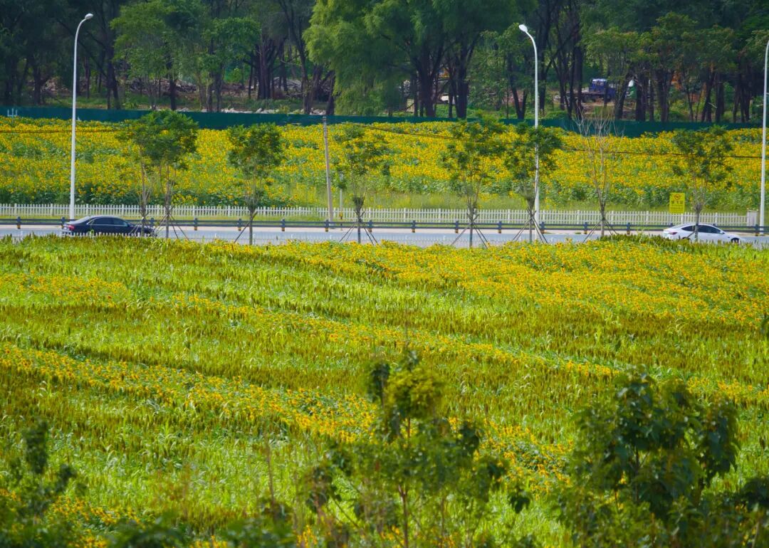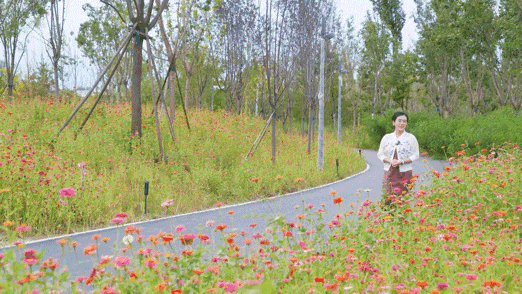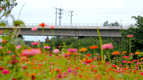 顺着园路往里走,视野瞬间开阔起来。大片花海顺着缓坡铺展,粉色的百日菊、黄色的金鸡菊交织成斑斓的色块,微风拂过,花浪起伏,引得蜜蜂在花丛中穿梭。偶尔有高铁列车从花海上方的轨道驶过,白色的车身与彩色花田、远处的绿树相得益彰,动静之间,勾勒出城市与自然交融的独特画面,游客随手一拍都是治愈系大片。