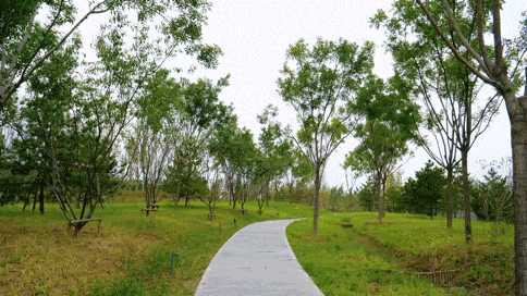 沿着园路漫步,首先映入眼帘的是迎宾广场。广场以浅灰色透水砖铺就,既兼顾生态环保,又透着简约大气。广场两侧种植了元宝枫与油松,枝叶在微风中轻晃,像是在向即将到来的游客挥手致意。