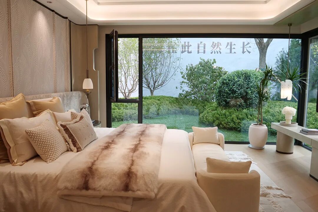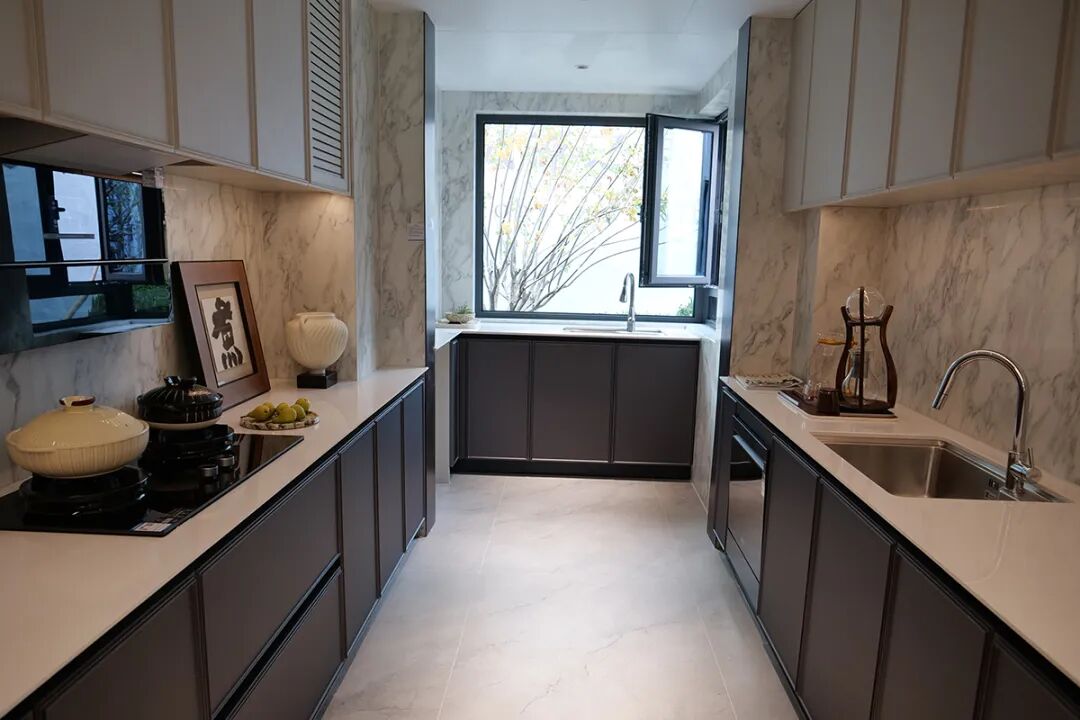 走进样板间,浅色系装修搭配木质感家具,温馨又大气,厨房U型布局预留双开门冰箱位置,台面挡水条、卫生间干湿分离设计,每处细节都体现着对居住的用心考量。