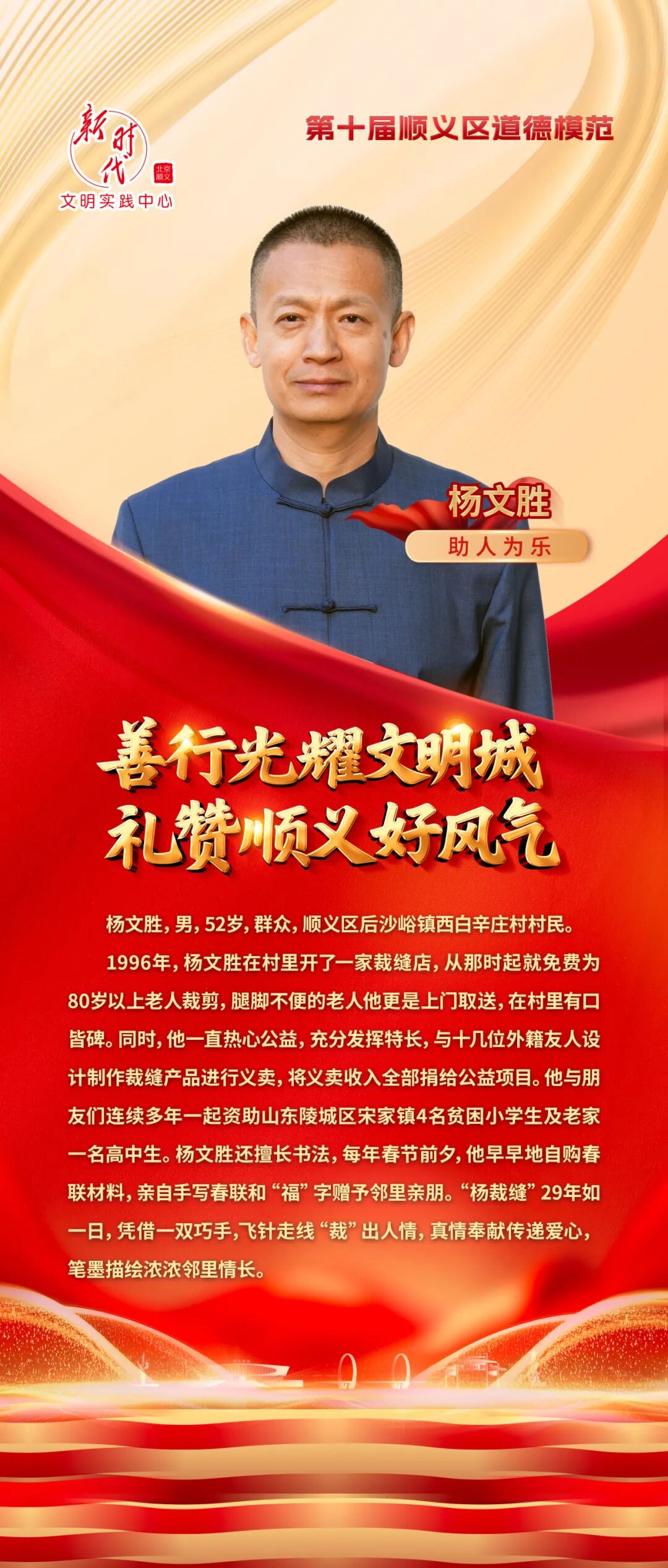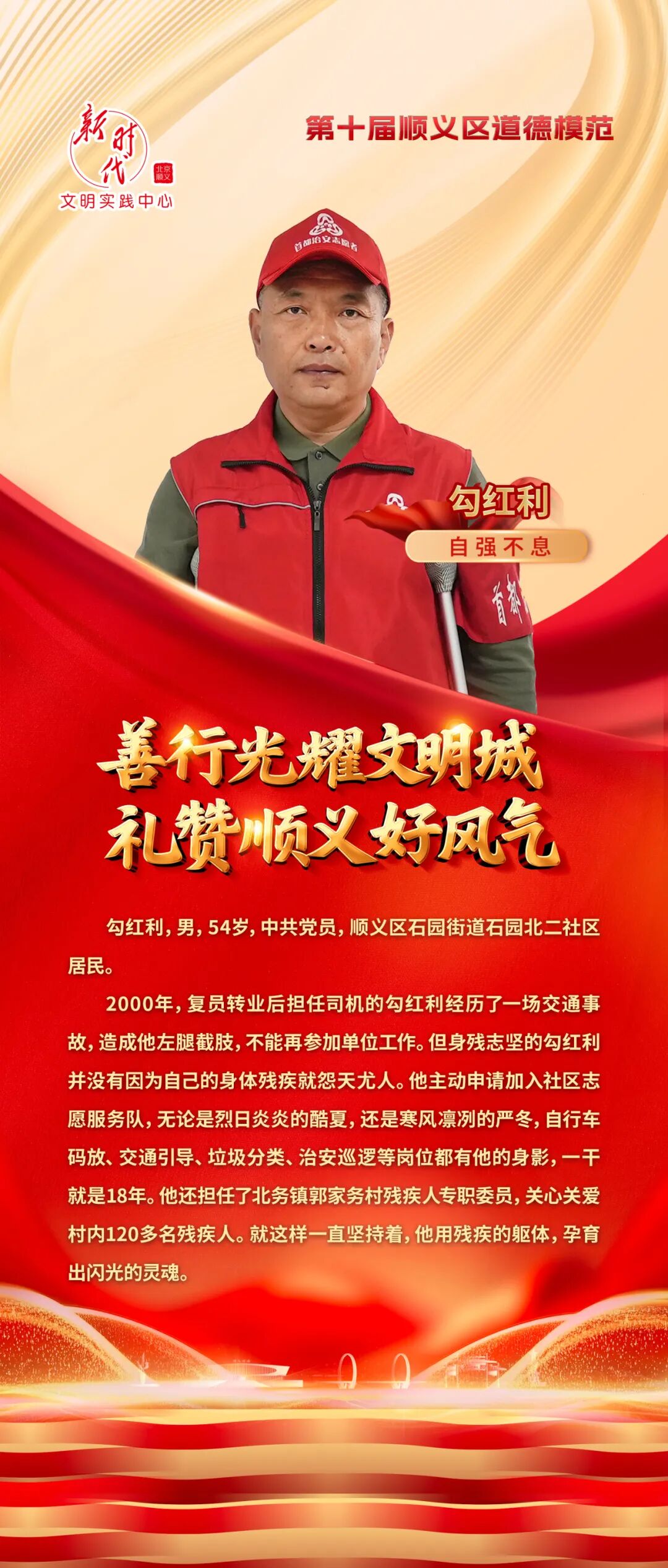 他们来自市井巷陌,却用善举温暖一方天地;他们立足平凡岗位,却以坚守诠释责任担当。从助人为乐的温情守护,到自强不息的向阳而生;从诚实守信的初心坚守,到敬业奉献的矢志耕耘,再到孝老爱亲的脉脉温情、见义勇为的挺身而出。第十届顺义区道德模范,以凡人之躯筑就精神高地,用实际行动书写新时代的美德篇章。