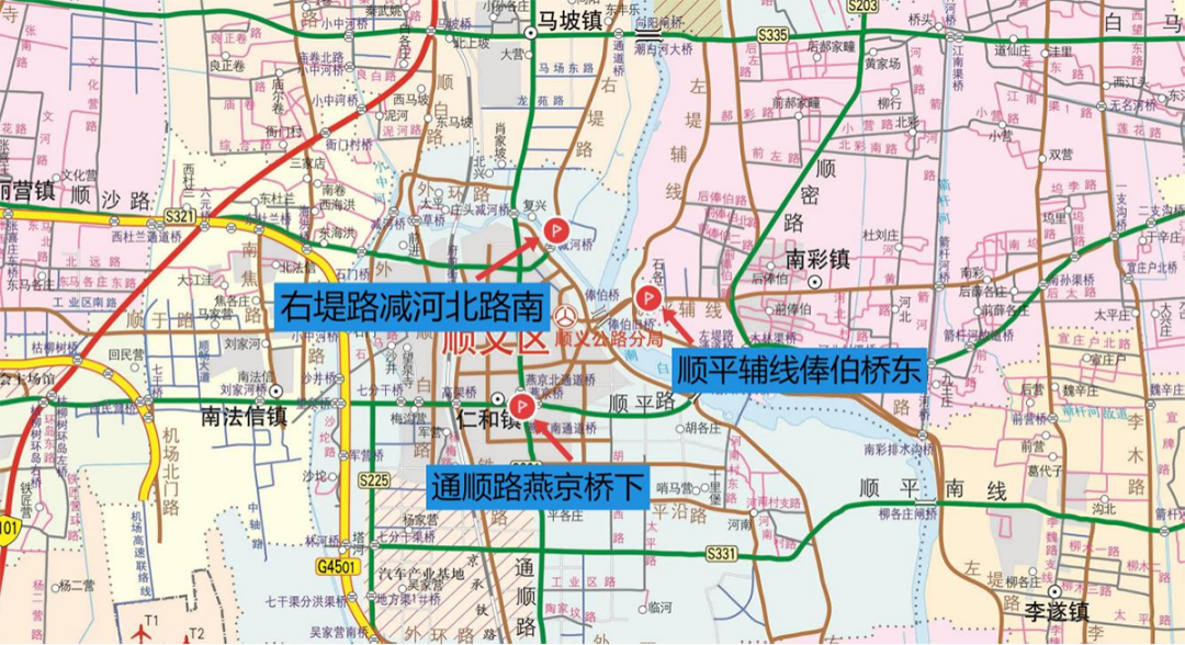 预测假期内,进出顺义城区日均交通量较大点位分别为顺平辅线俸伯桥东、通顺路燕京桥下、右堤路减河北路南。