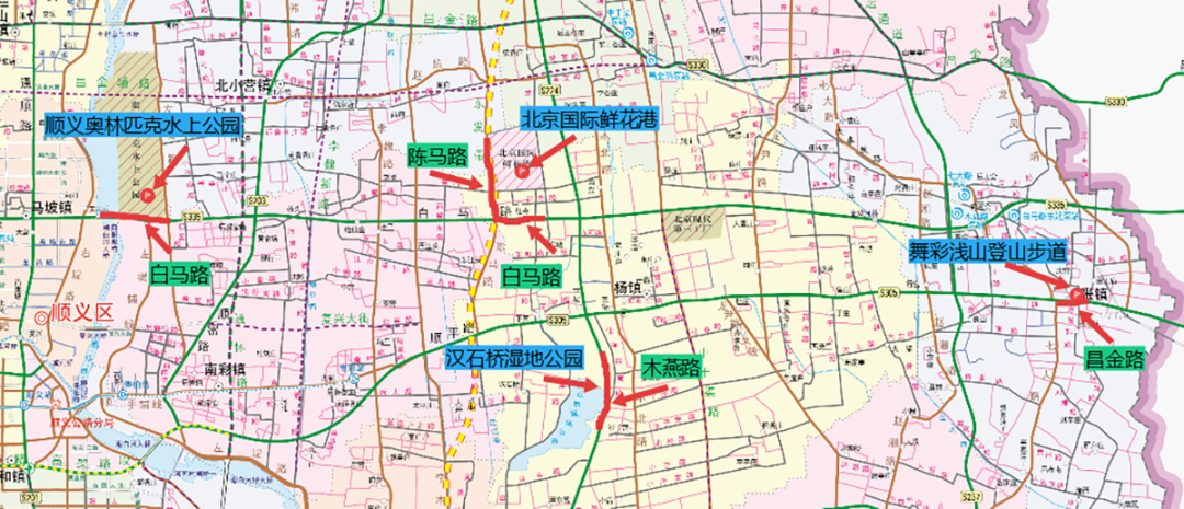 顺义区主要景区包括顺义奥林匹克水上公园、北京国际鲜花港、汉石桥湿地公园、舞彩浅山。预测假期内景区周边陈马路、白马路、昌金路、木燕路等日均交通量环比上月将有所上升。8时至10时为景区入园高峰时段,车辆较为集中,会出现短时行驶缓慢。