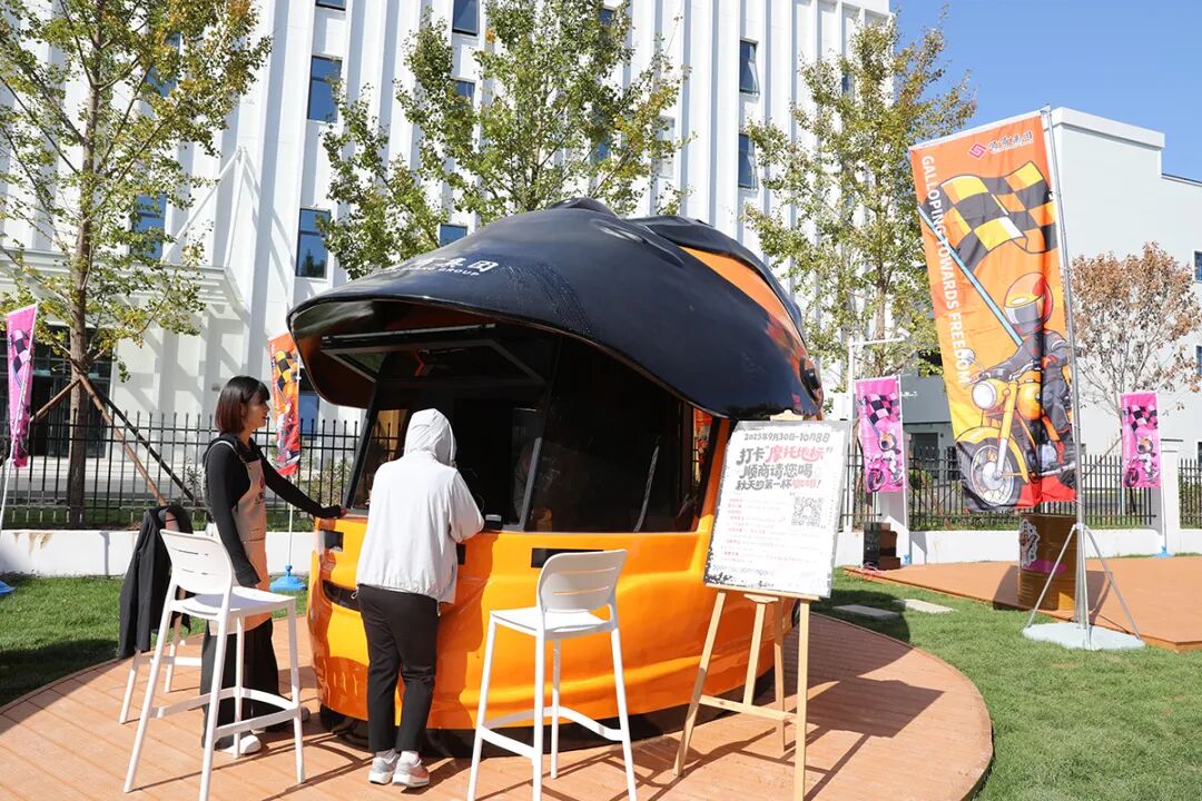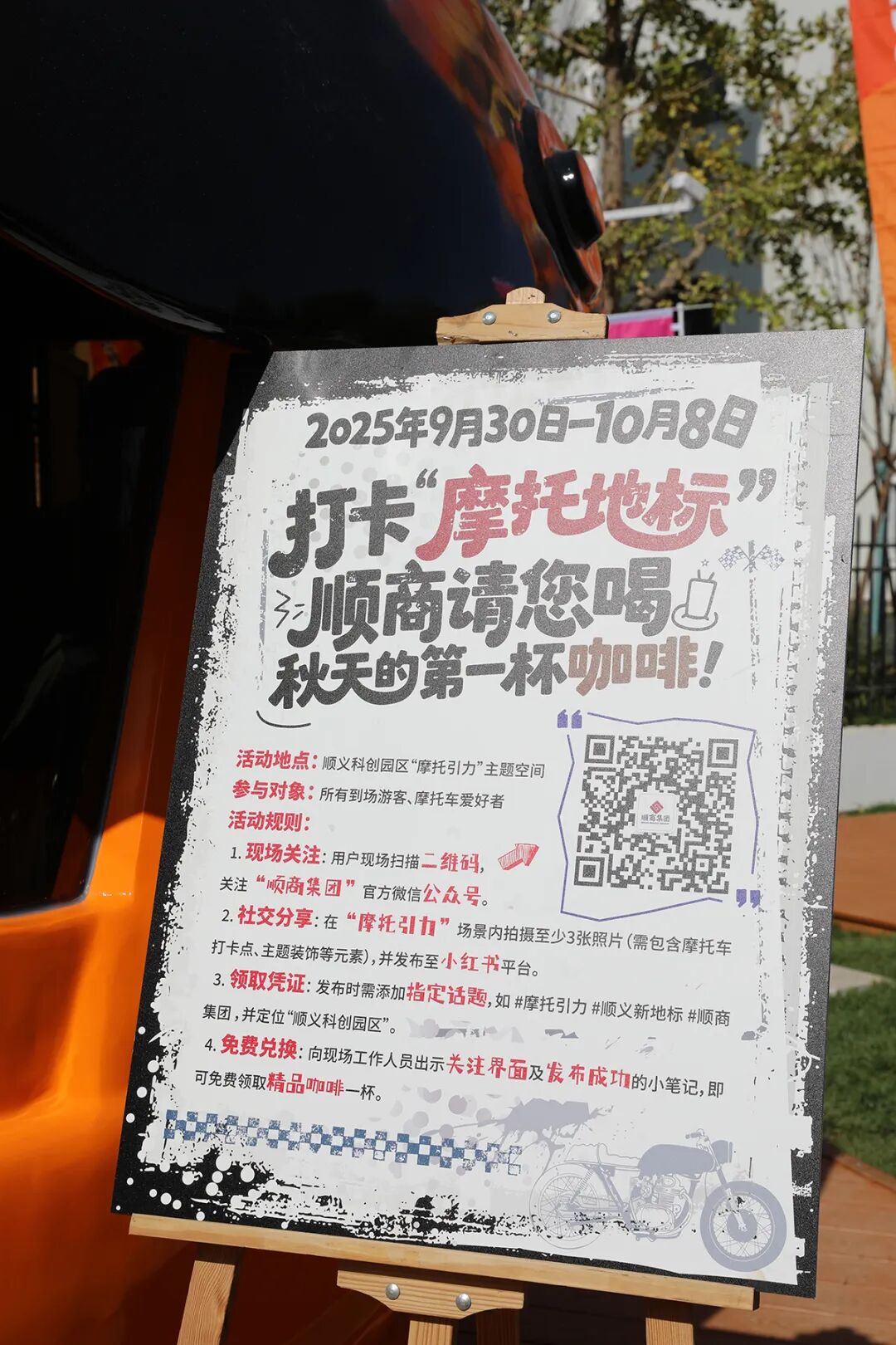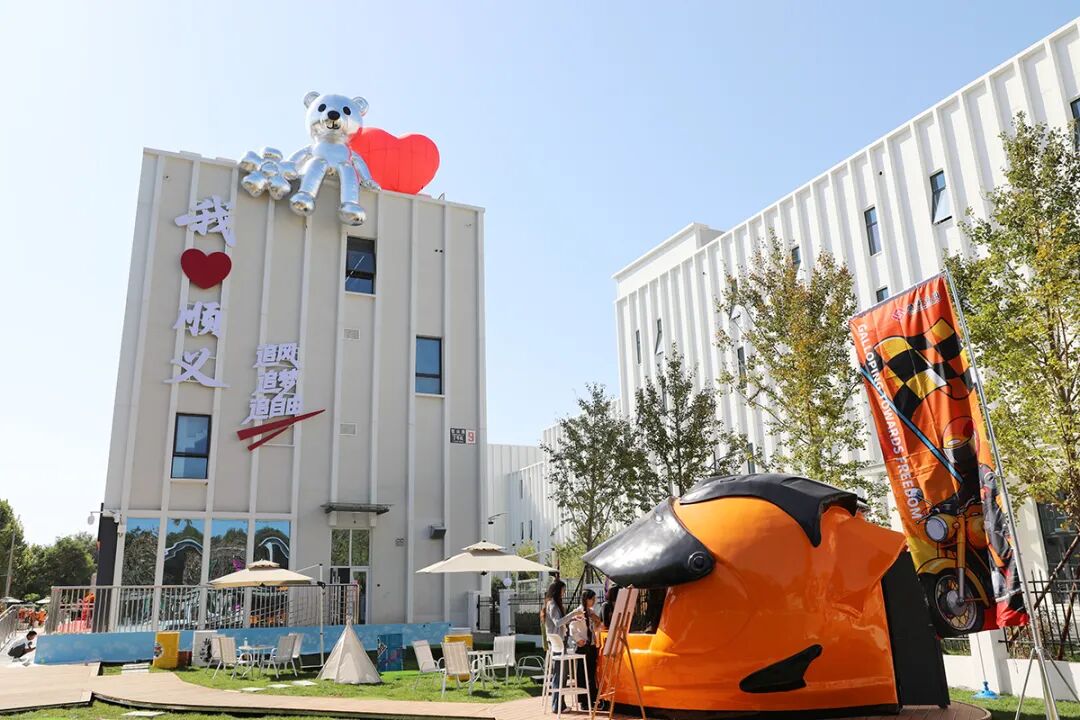 项目最引人注目的是广场上以“摩托引力”为主题的“头盔咖啡屋”,采用橘黑撞色和粉黑撞色设计,酷感十足,每栋楼旁各设置了一个。楼顶还矗立着憨厚可爱的“我爱顺义”主题小熊IP装置,搭配绿茵草地、休闲天幕,无论是打卡拍照还是闲坐聊天,都能让人感受到惬意氛围。9月30日到10月8日,参与现场相关活动,还可以免费领一杯精品咖啡。