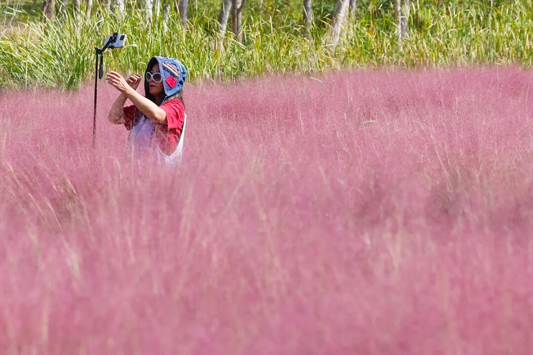 花间小径上,人影绰绰。有人隔着步道用长焦镜头小心定格远景,有人蹲在木栈道上专注捕捉花穗的细微之美。夕阳西下时的花海最为动人,斜阳为粉色花海镶上金边,仿佛时间放慢了脚步。