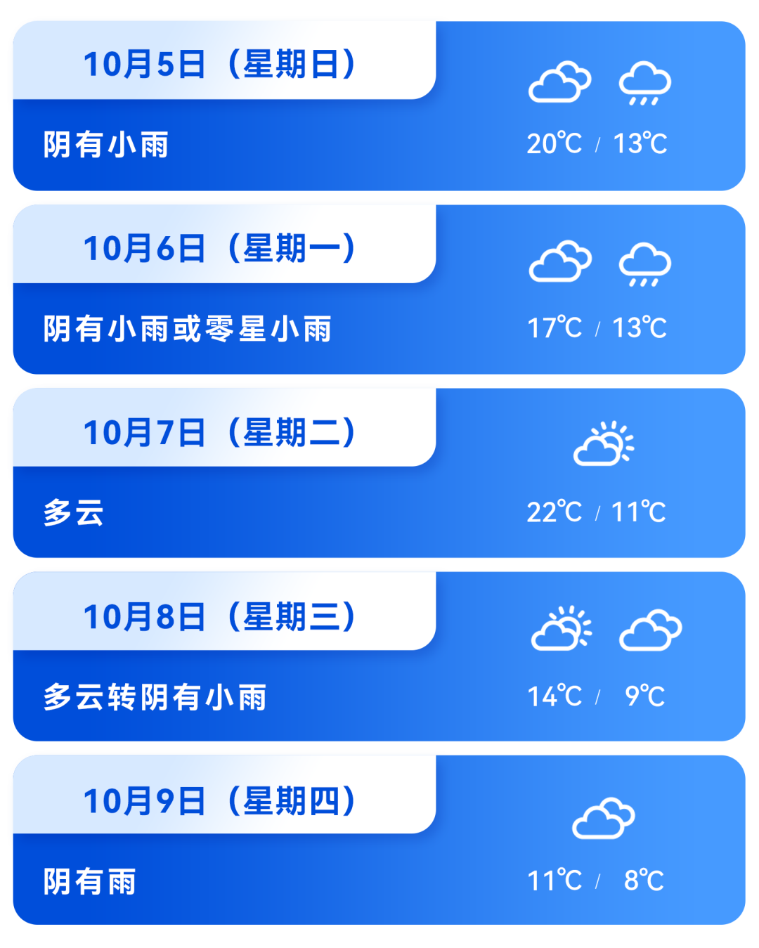 据区气象台消息,今天夜间阴转零星小雨或小雨,南转北风2级左右,最低气温17℃;明天白天阴有小雨,北转东风3级左右,最高气温20℃。未来三天云量逐渐增多,5日早晨到6日白天有间歇性小雨,总体雨量不大,气温明显下降。