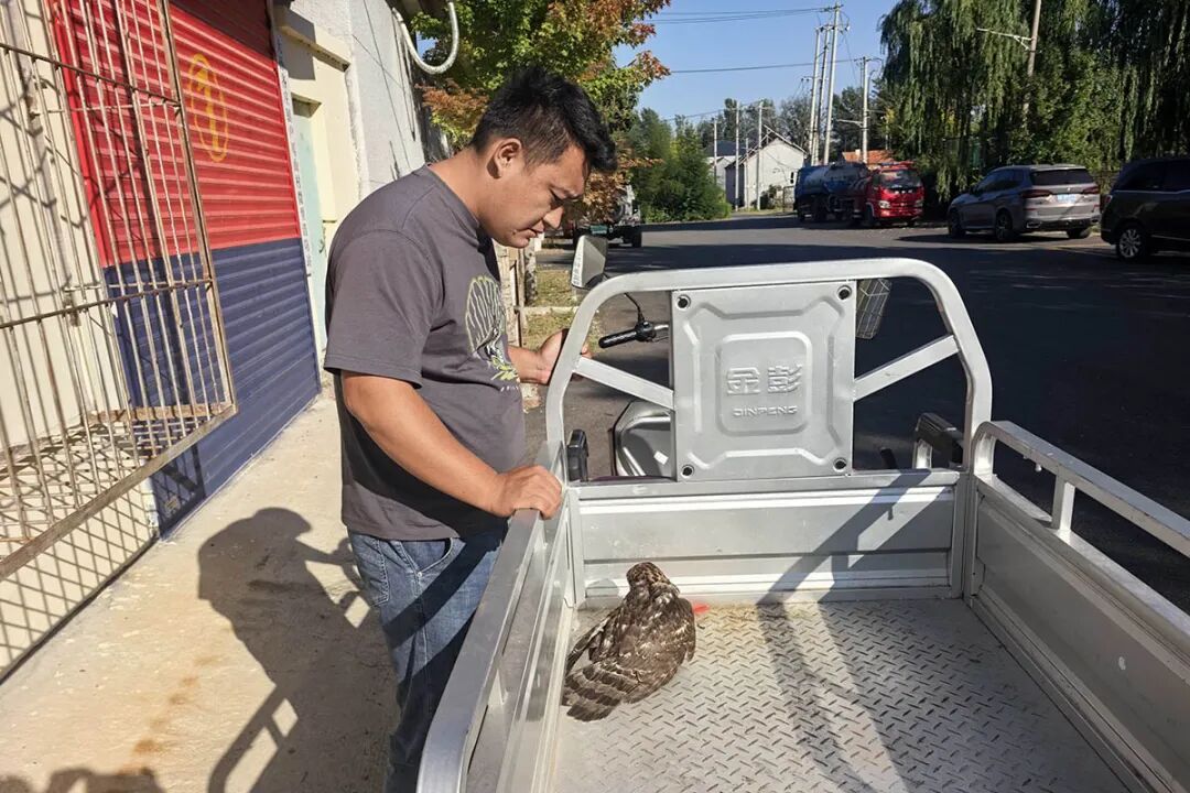 更让他揪心的是,这只老鹰左眼明显受伤,左翅膀还在渗血,羽毛上沾着未干的血迹,只能勉强挣扎却无法起飞。赵帅第一时间联系大孙各庄派出所,约定在村委会门口交接。