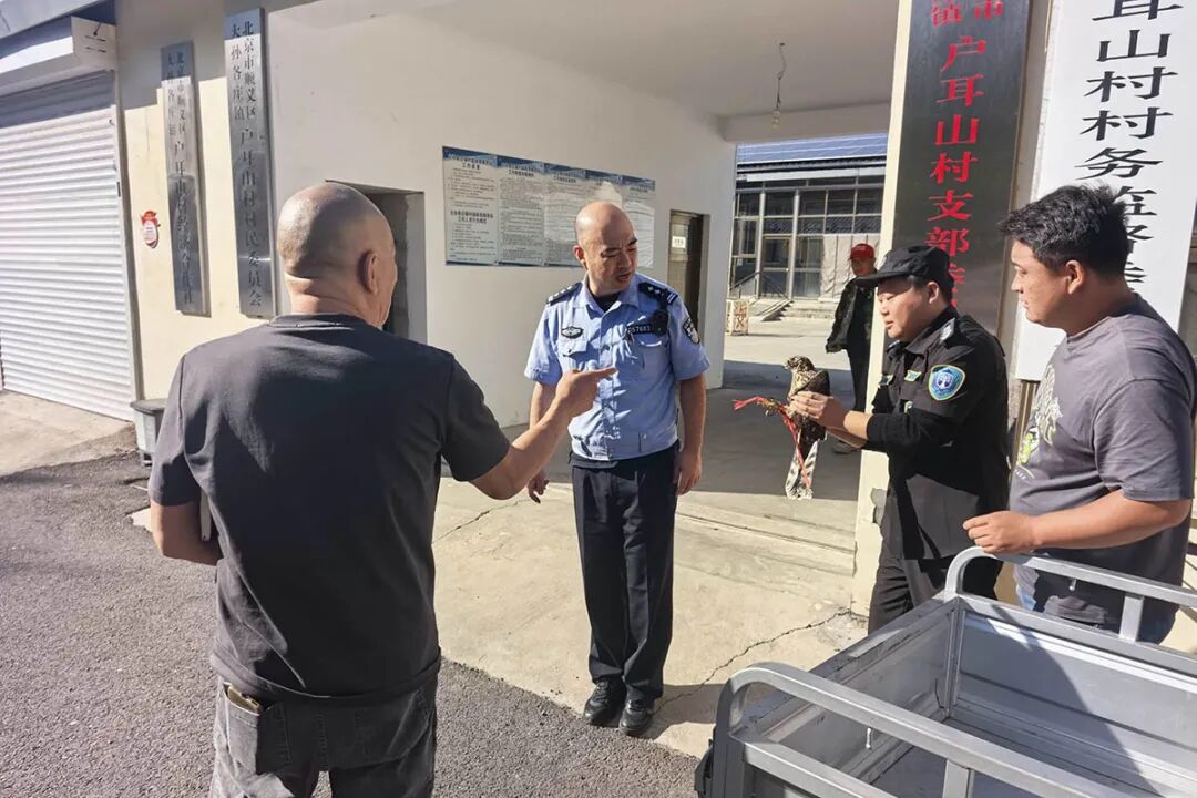 为避免老鹰因挣扎加重伤势,赵帅特意返回电动三轮车取来绳子,小心翼翼地固定住老鹰双脚,再双手捧着将它安置在车后斗。前往村委会的途中,他还多次停车查看,生怕车辆颠簸影响“伤员”状态。15时30分许,赵帅将老鹰交到了民警手中。
