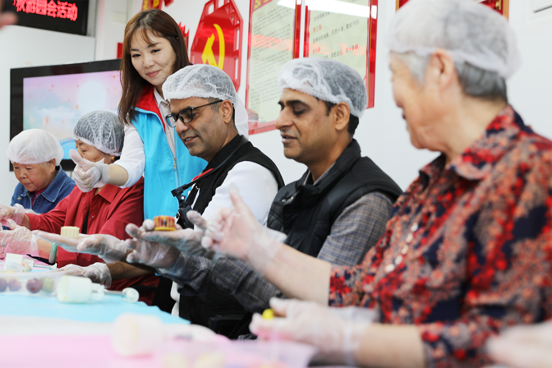 在三山新新家园社区,外籍居民Shiv Kumar第一次尝试用模具压出月饼花纹。他说:“这是我最喜欢的环节,感觉非常棒,希望明年我们还能参加这个活动。”旁边的义诊区,快递员贾静茹刚做完推拿。“今天在三山新新家园社区过节非常开心,大家一起做月饼、玩游戏、了解中医文化,特别温暖。”贾静茹说。