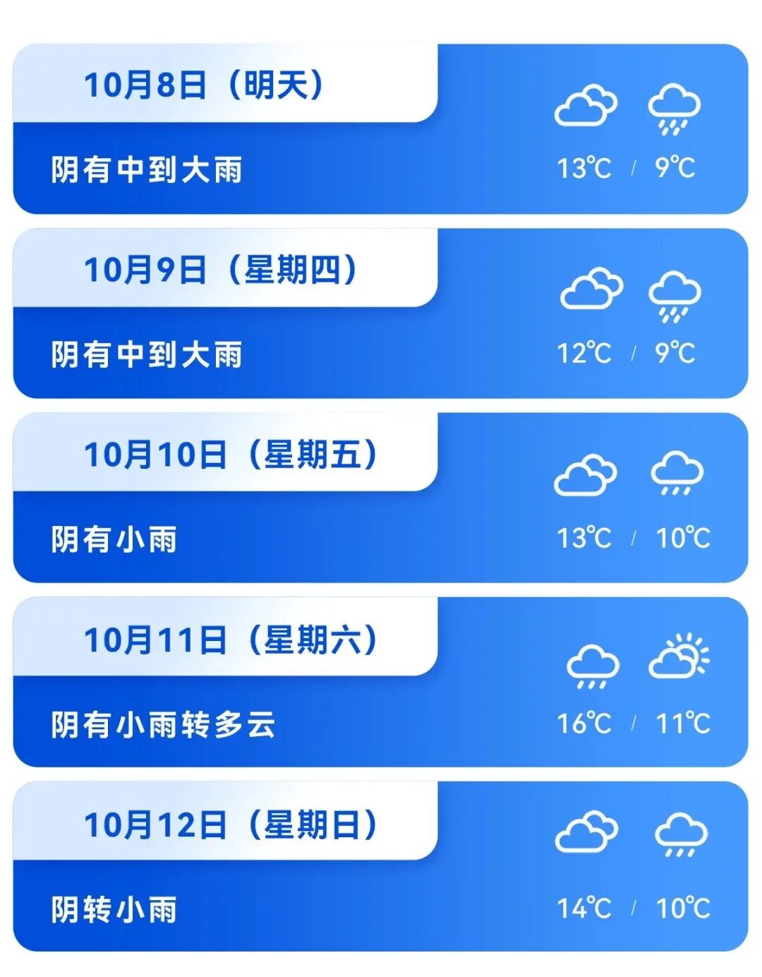 根据最新的气象资料分析,10月8日至11日持续性降雨天气。降雨将导致路面湿滑,能见度不佳。对明天假期返程及首个工作日(9日)早晚高峰出行有不利影响,请提前关注路况信息,注意防雨和交通安全。