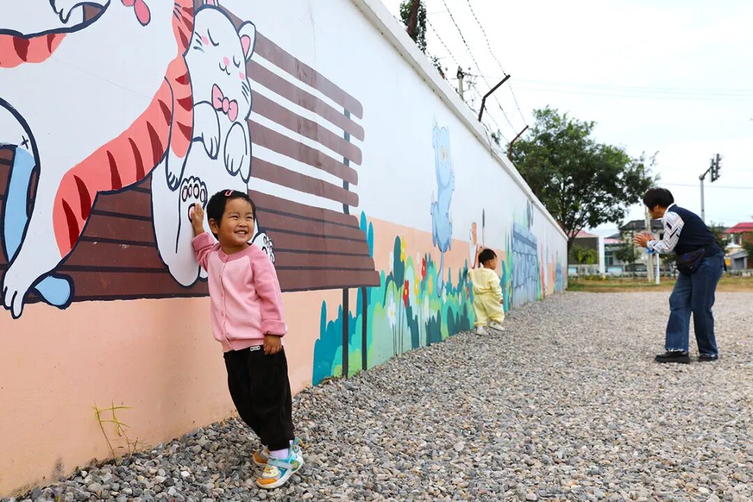 小朋友在彩绘墙前玩耍。