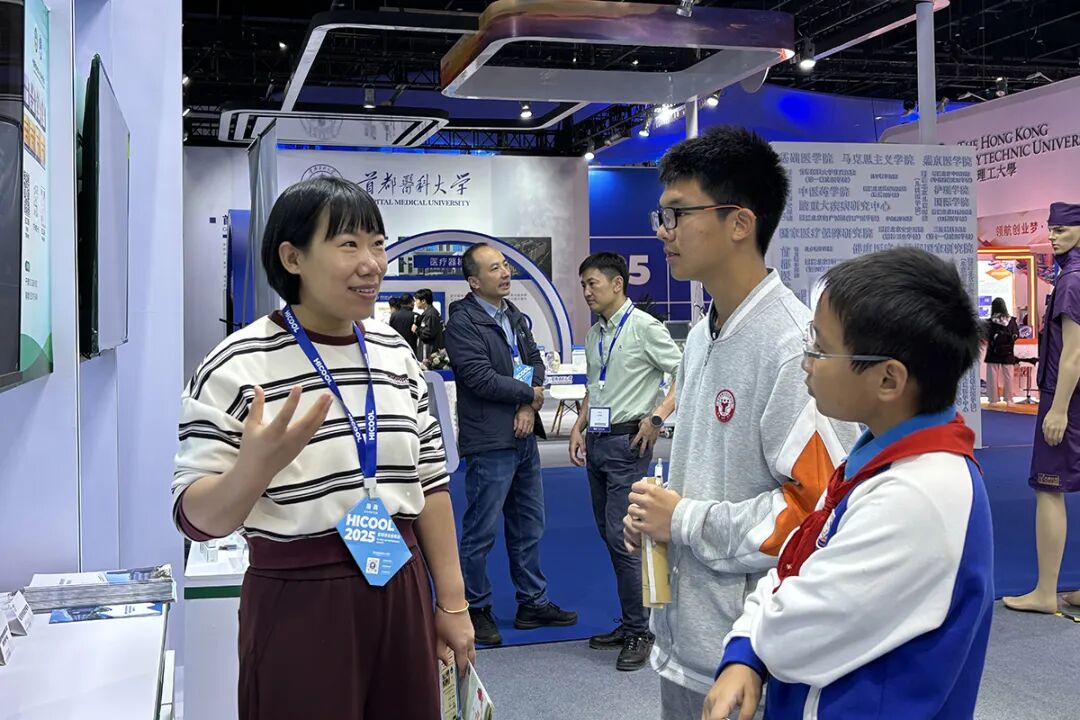 活动现场,中小学生首先走进世界一流高校展区,在清华大学、北京协和医学院、香港理工大学展区驻足了解。仁和中学初二(15)班学生丁曦冉说:“刚刚参观了北京协和医学院展区,我发现现在可以借助AI为不同年龄段的患者提供更精准、更科学的治疗。我以后想成为一名医生,现在我要好好学习化学、生物学等方面的知识,为以后打下坚实基础。”