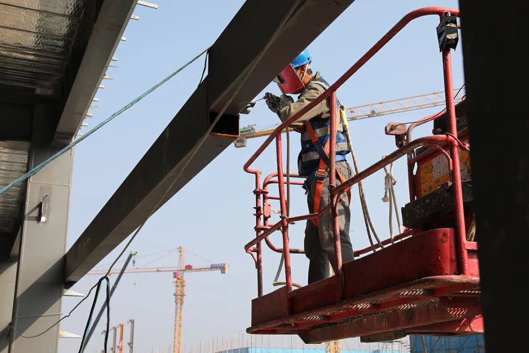 楼体内部,防火涂料喷涂作业正在进行。外部施工机械上,外墙龙骨焊接工作有序开展,二次结构施工与外立面工程同步推进,各环节衔接紧密、效率高效。