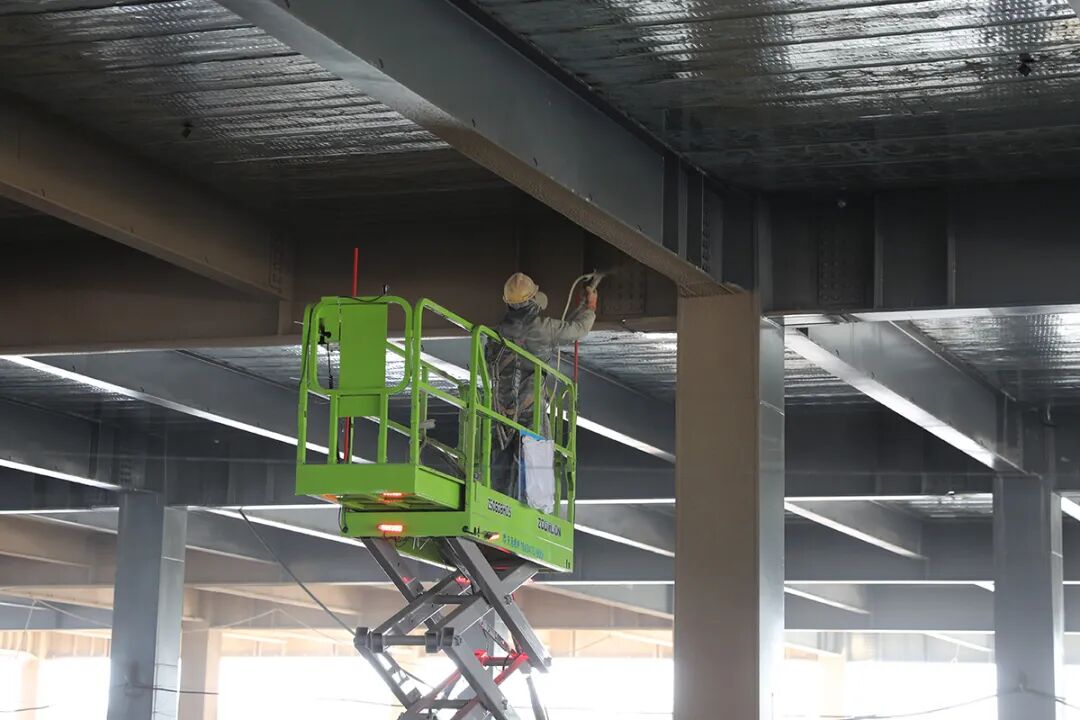 工人进行防火涂料喷涂、龙骨焊接工作。