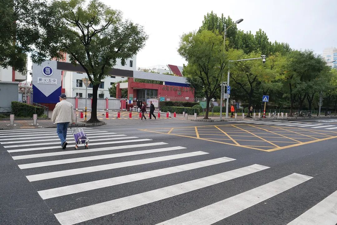 记者在顺义五中校门口看到,道路不仅施划了黄色网格线、减速(振荡)标线、礼让行人标线,还增设了警告标志和反光道钉。提示司机,行驶到学校门口减速让行,为师生、家长的安全出行提供保障。“看见校门口道路有了这些变化,我们心里踏实了很多。”家长周玉桥说。