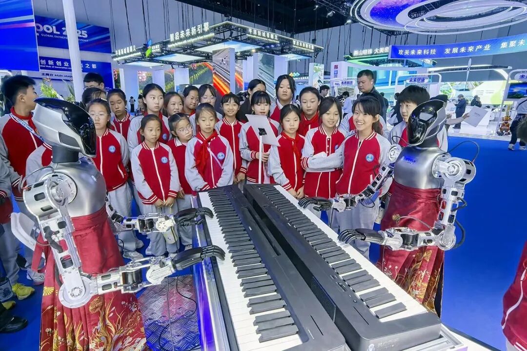 智能农业机器人正在为农作物授粉、穿刺导航系统帮医生精准定位、航空材料制成的乐器音色优美、机械手臂集体灵巧做出各种复杂动作,吸引孩子们驻足体验,不时发出惊叹:“真奇妙!”