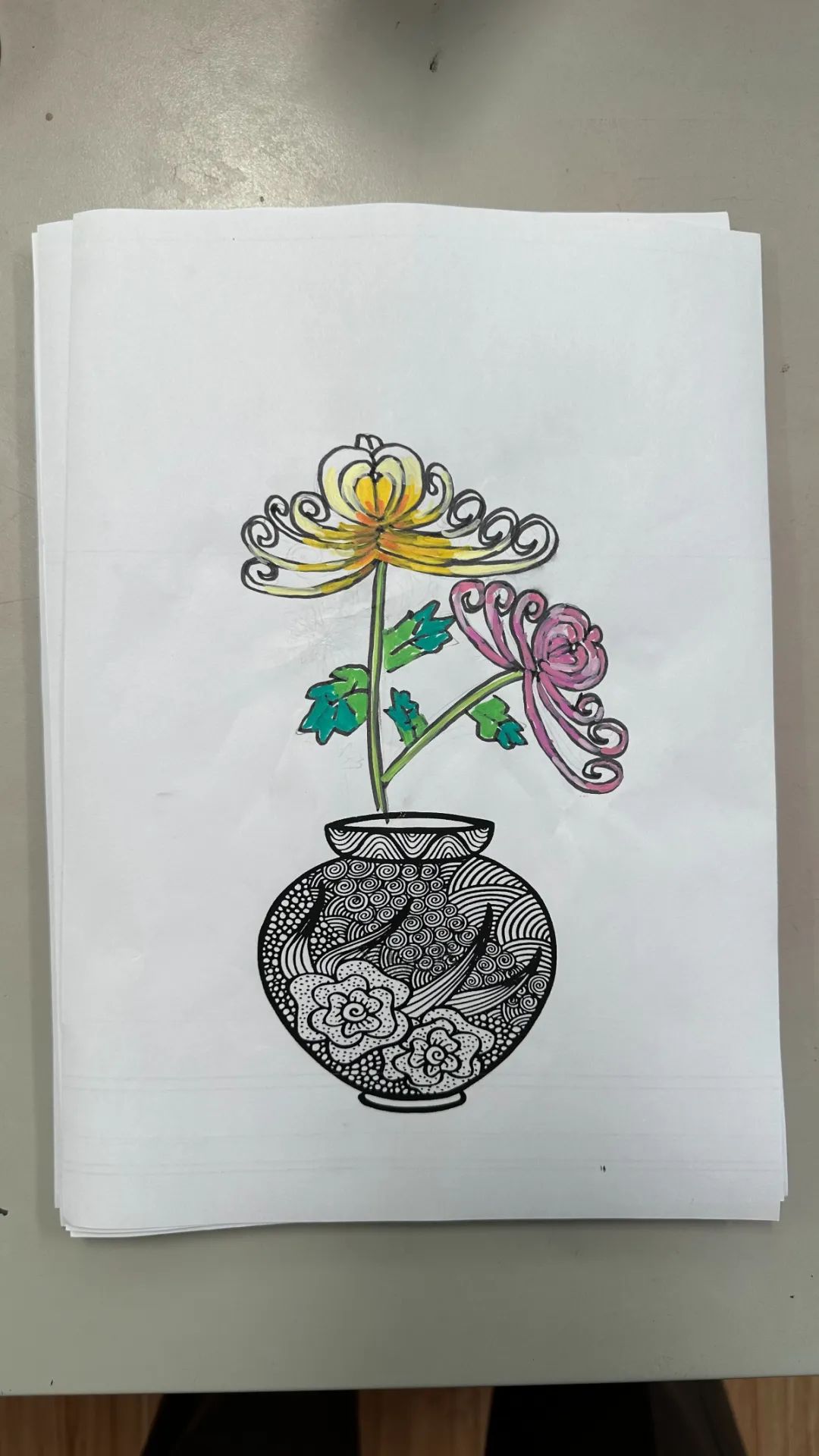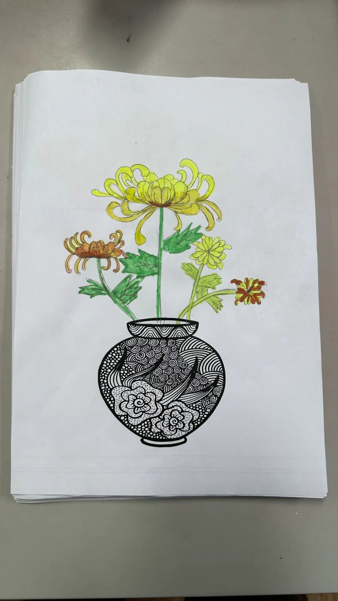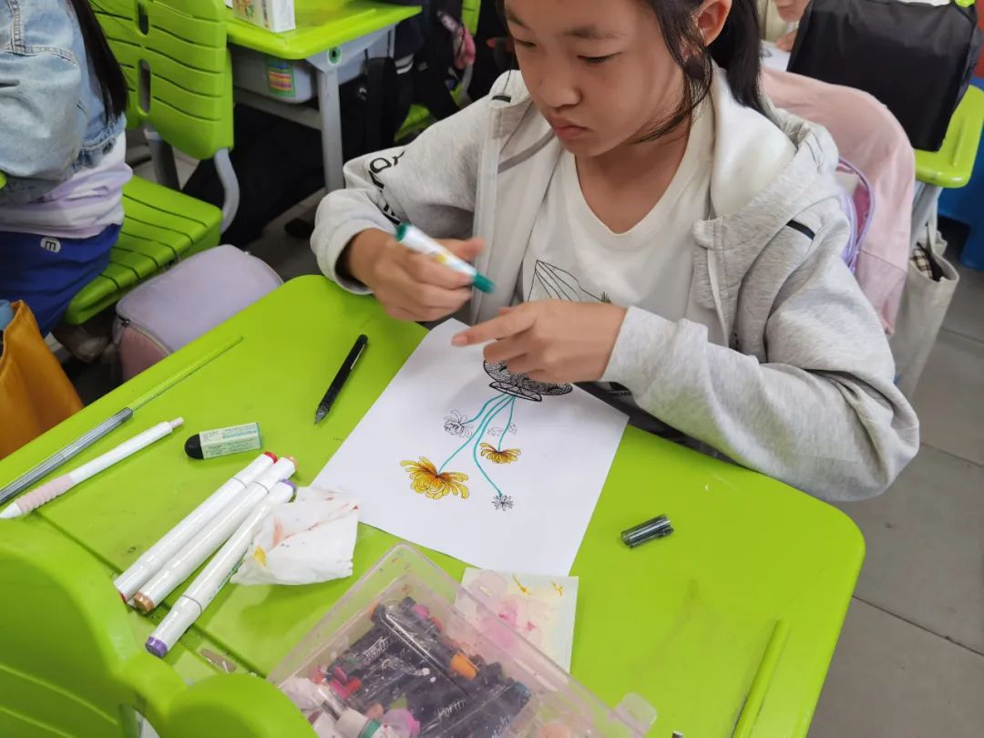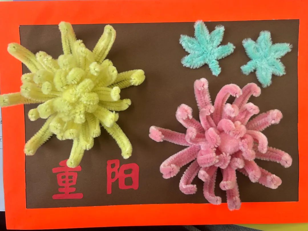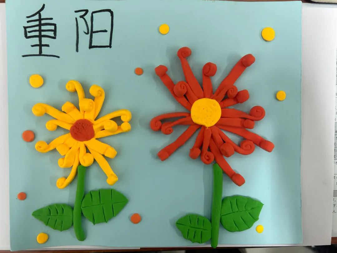 在美术课程中,教师带领同学们以重阳文化中的菊花为创作元素。通过赏菊观察菊花的结构、生长形态,通过绘菊学习菊花的画法,创作艺术作品,表达自己对老人的节日祝福。请看同学们的精彩作品:
