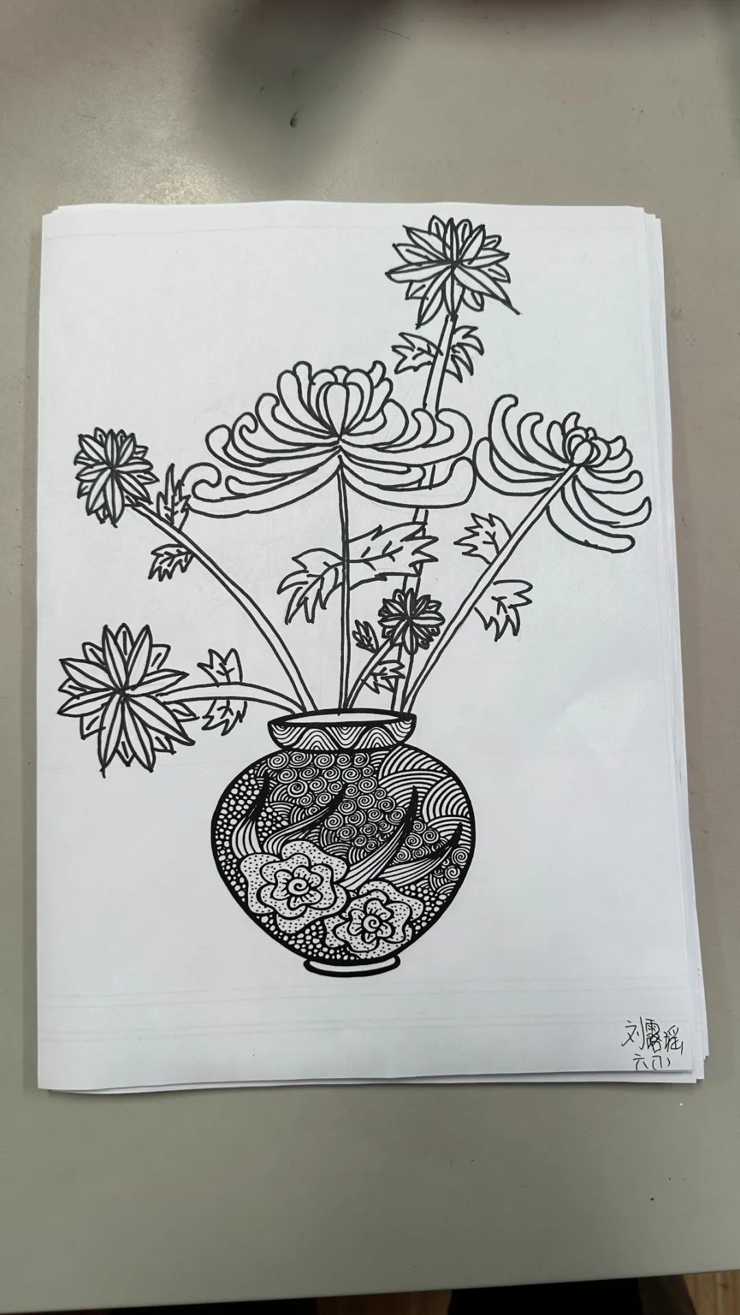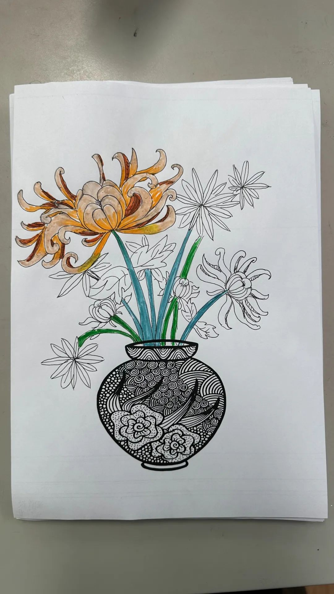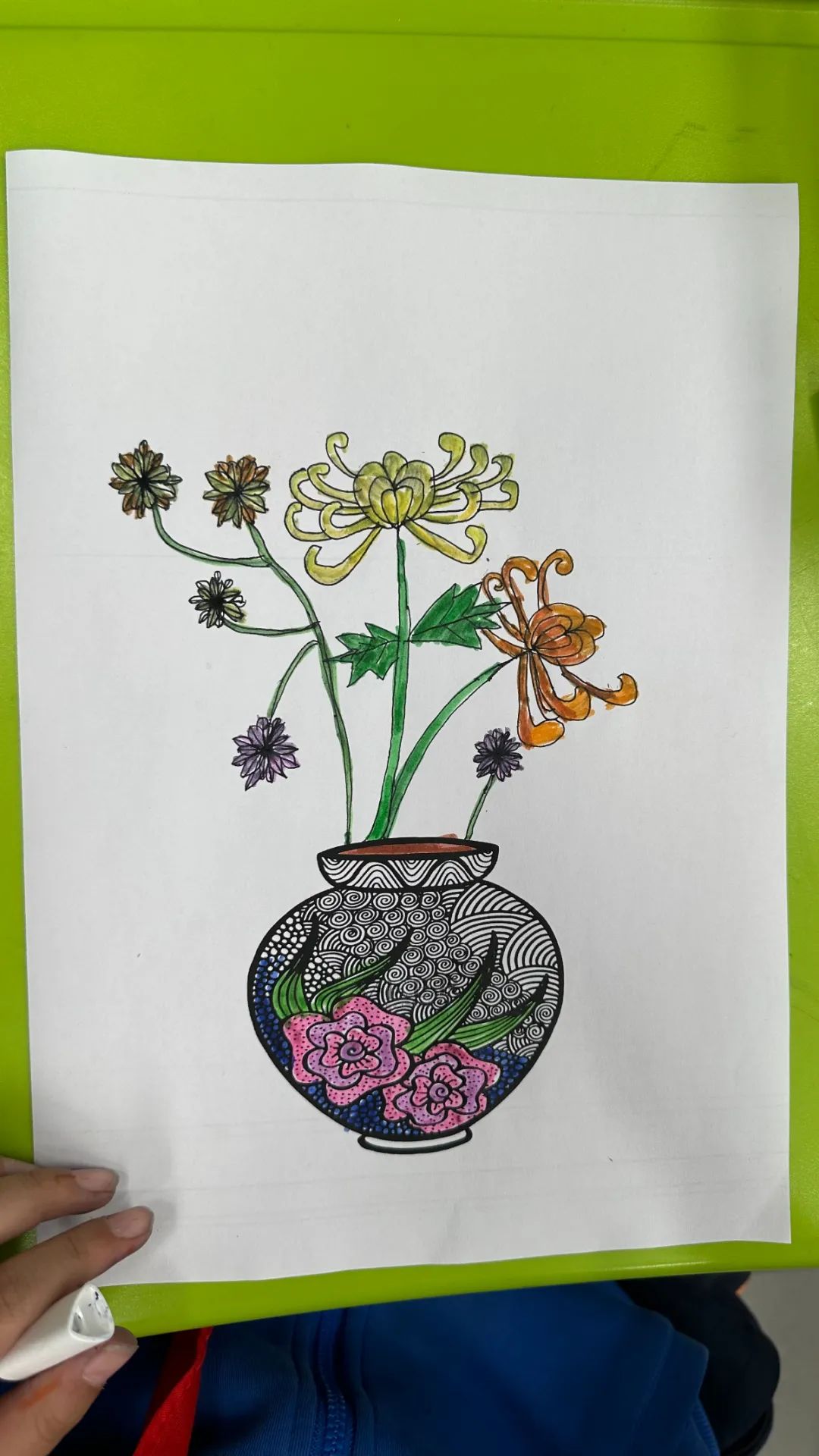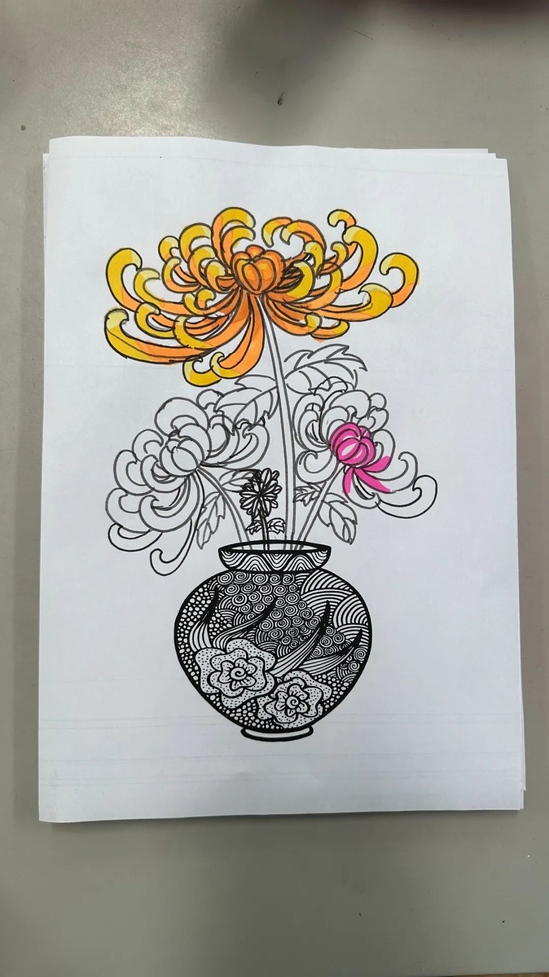 在美术课程中,教师带领同学们以重阳文化中的菊花为创作元素。通过赏菊观察菊花的结构、生长形态,通过绘菊学习菊花的画法,创作艺术作品,表达自己对老人的节日祝福。请看同学们的精彩作品: