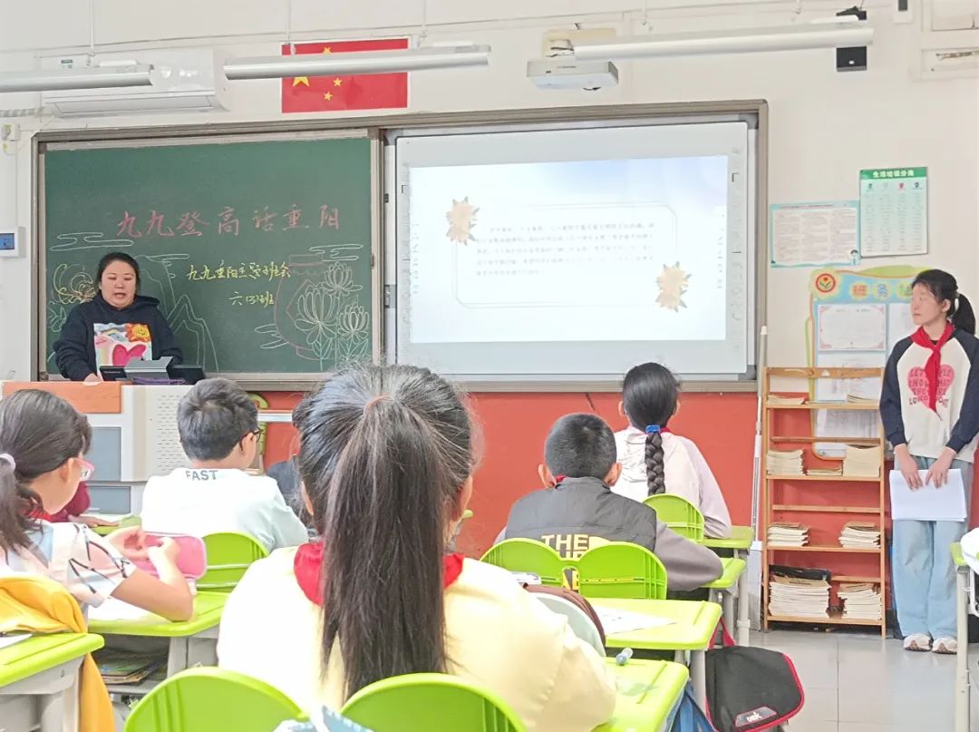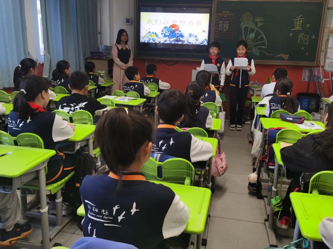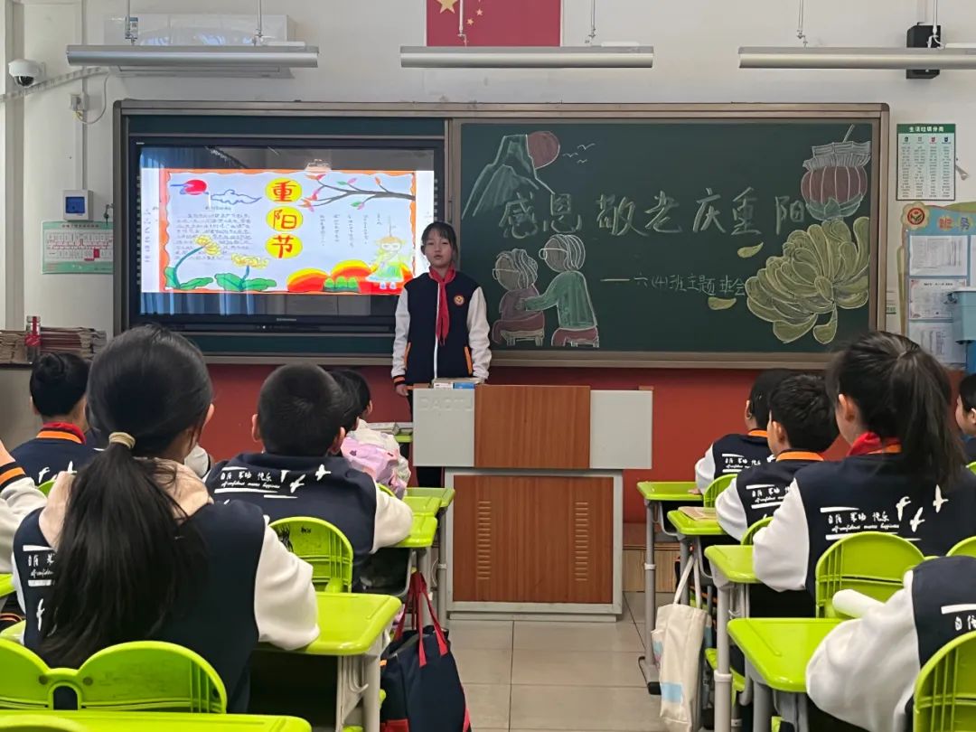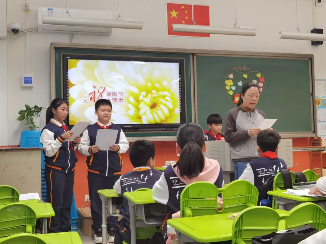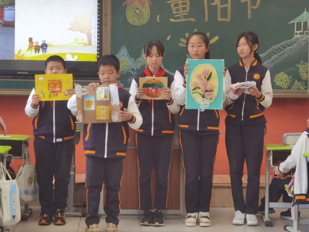 班主任教师组织学生进行以“感恩敬重阳”为主题的教育活动,学生们综合梳理课程学习中的收获进行学习成果汇报:重阳节的历史演变、重阳习俗的细致演绎、重阳诗词的朗声吟诵、尊老敬老的身边故事、对家中老人的肺腑之言、为老人设计制作的重阳礼物……每位同学都是重阳文化的代言人,在亲情洋溢的氛围中感悟重阳节蕴藏的精神价值,明确敬老孝亲要落实在每日行动中。