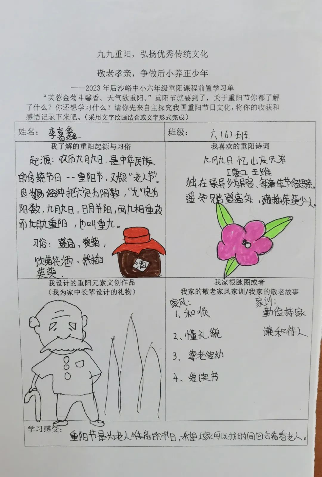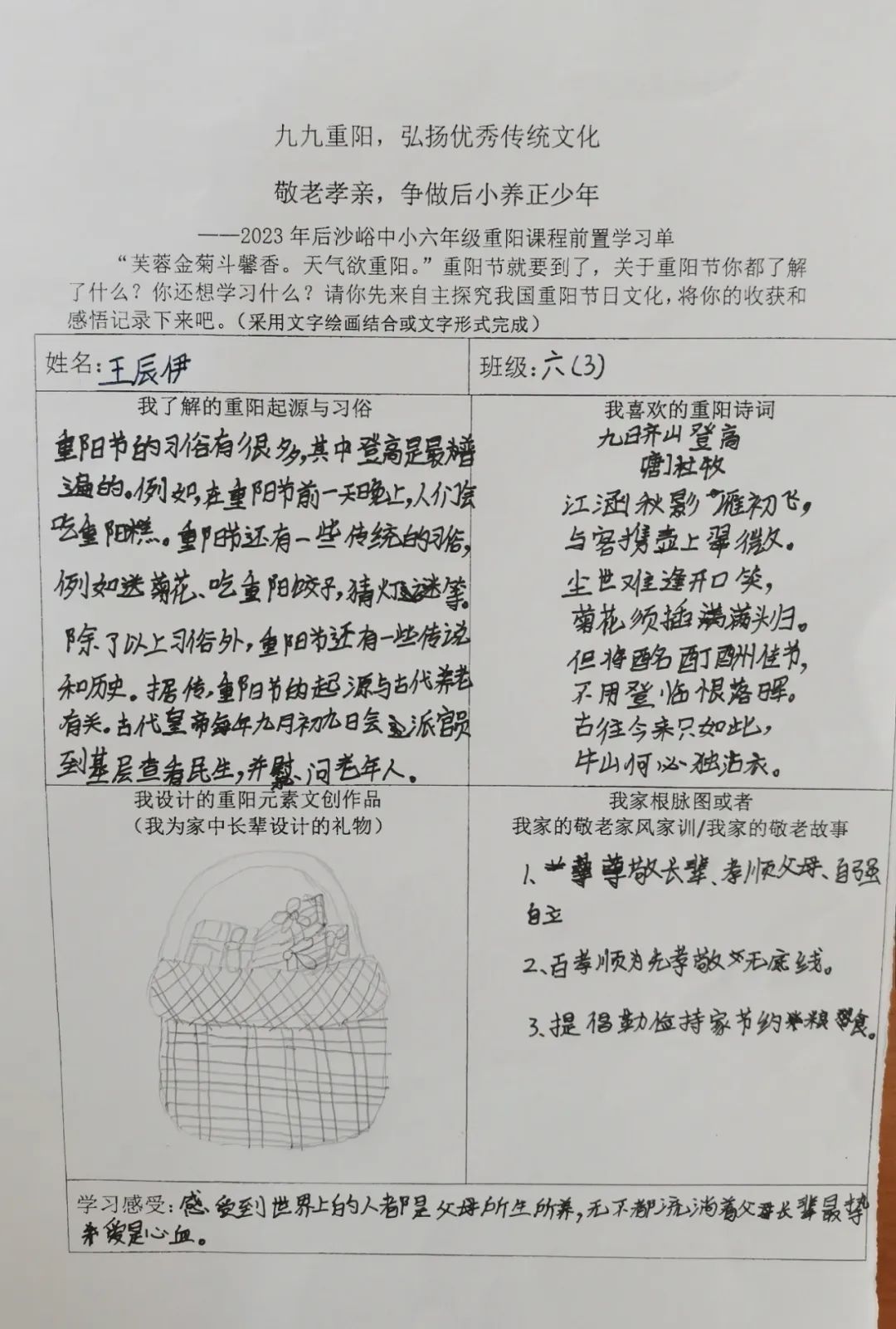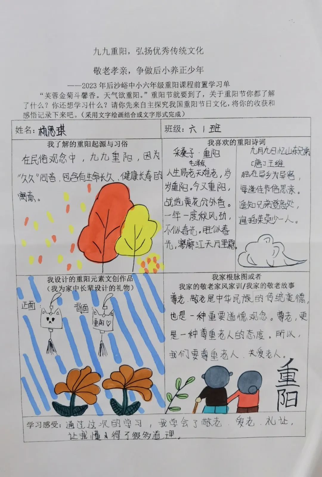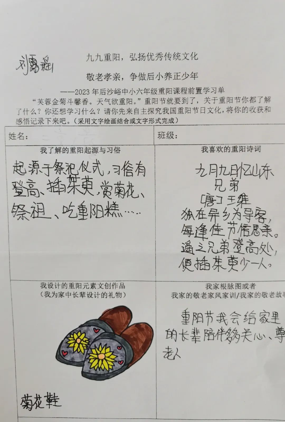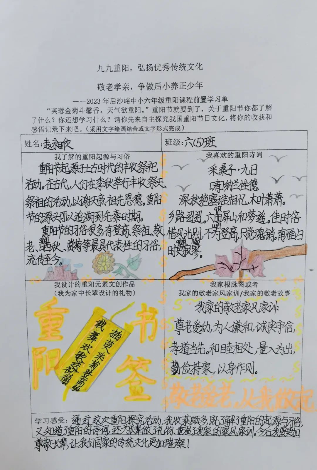 同学们开展自主学习,围绕重阳节的起源与习俗文化、重阳诗词歌赋、自家敬老家风家训和重阳元素的文创作品设计几方面进行前置学习,为重阳课程实践做好充分准备。