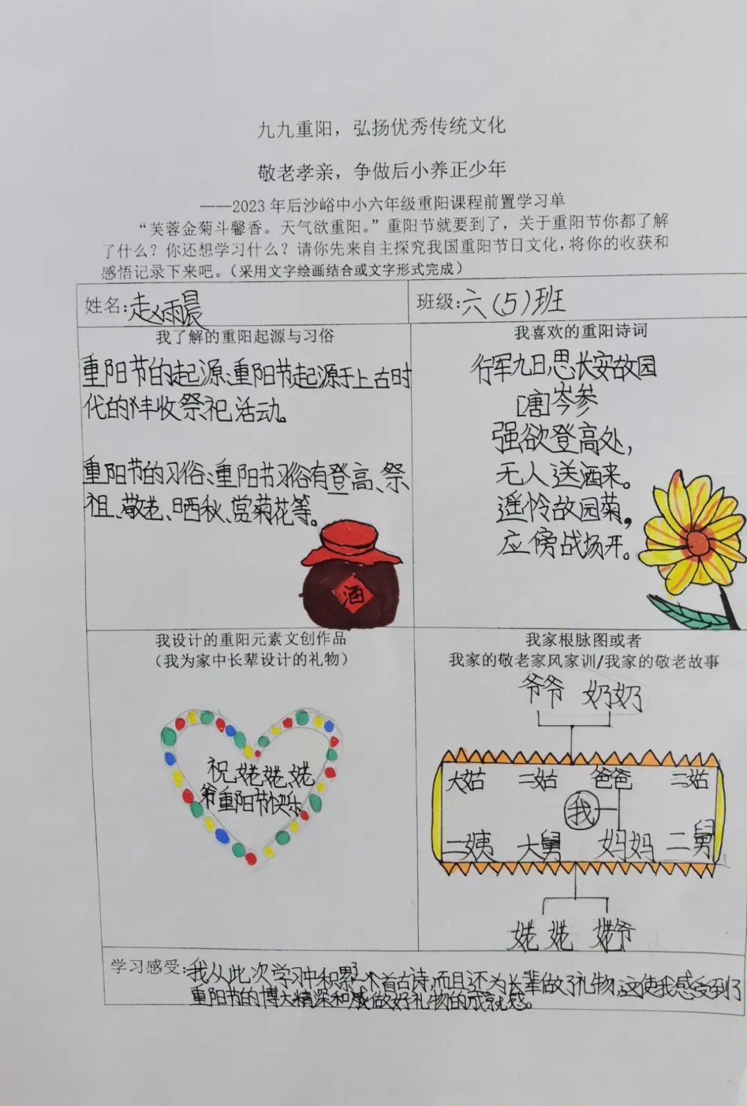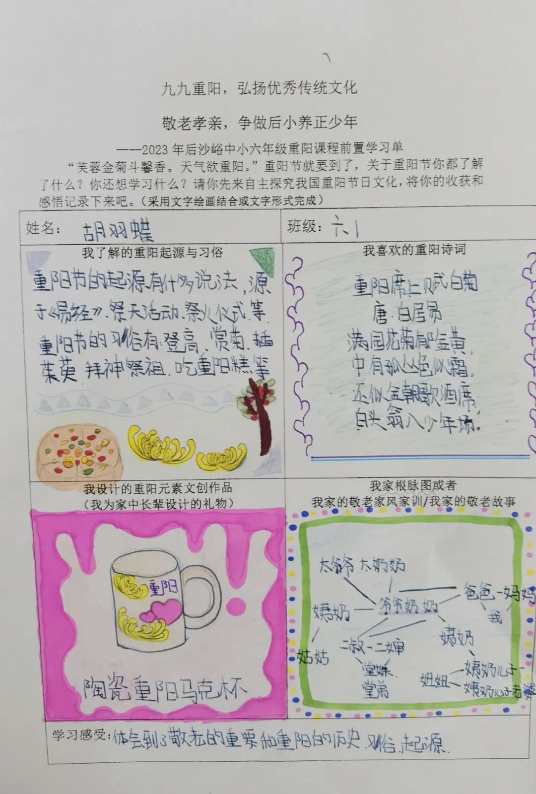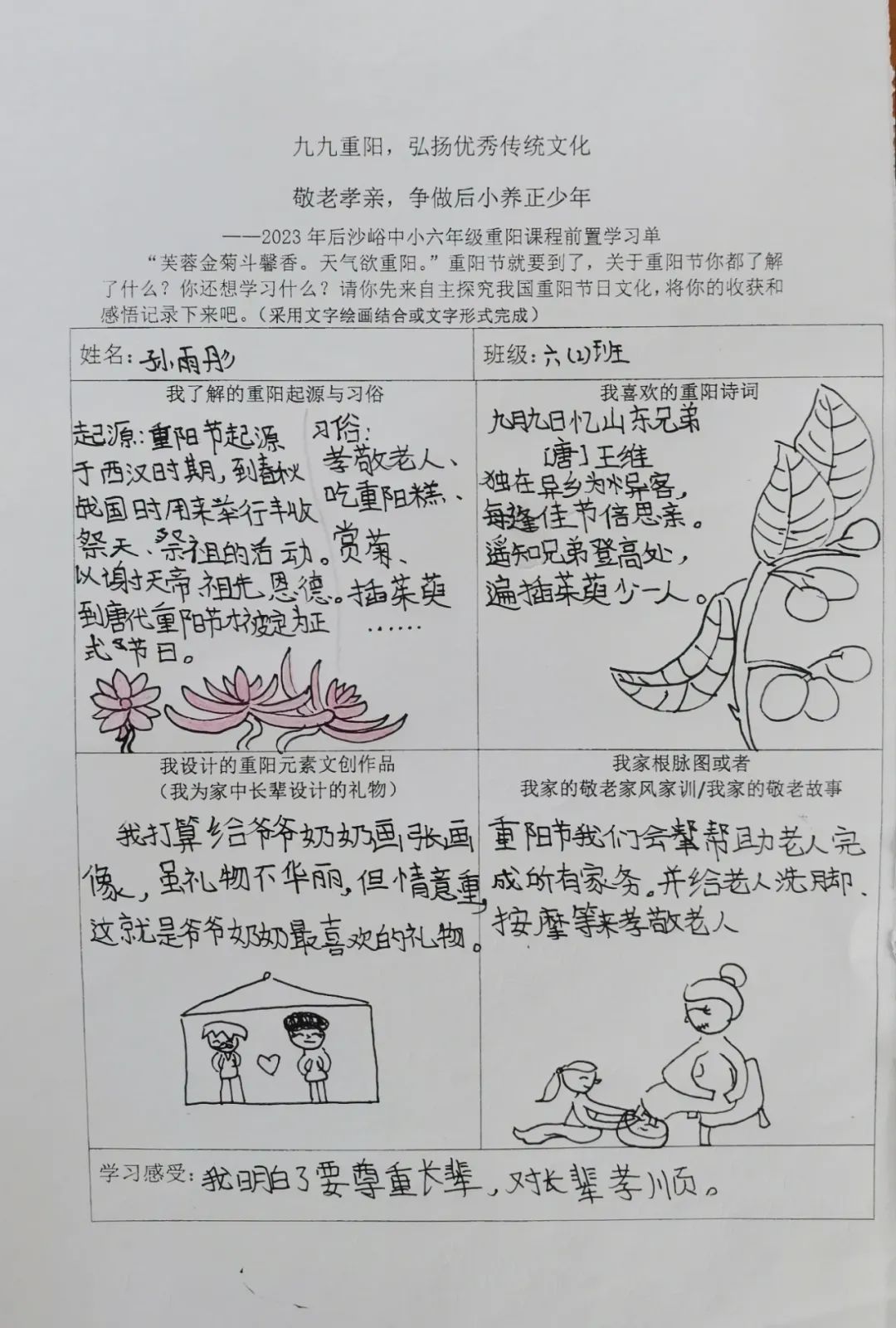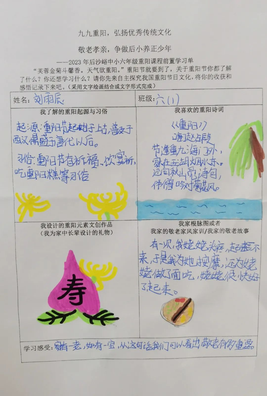 同学们开展自主学习,围绕重阳节的起源与习俗文化、重阳诗词歌赋、自家敬老家风家训和重阳元素的文创作品设计几方面进行前置学习,为重阳课程实践做好充分准备。