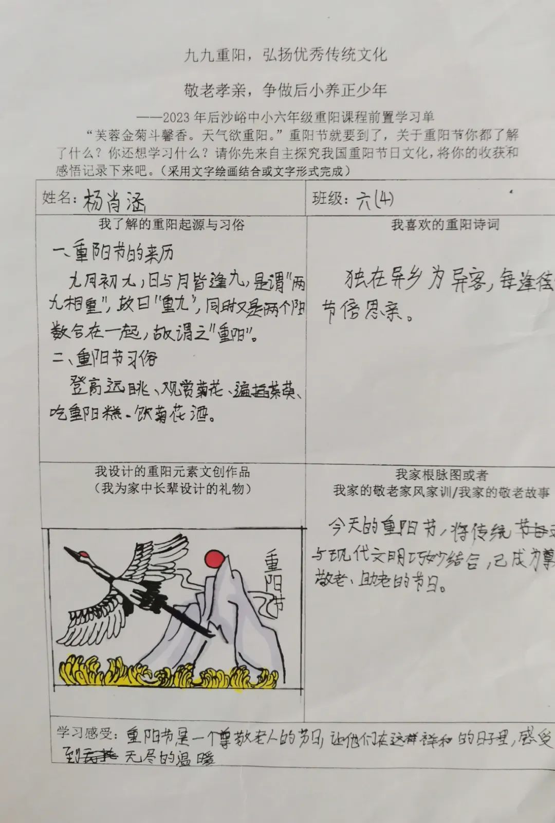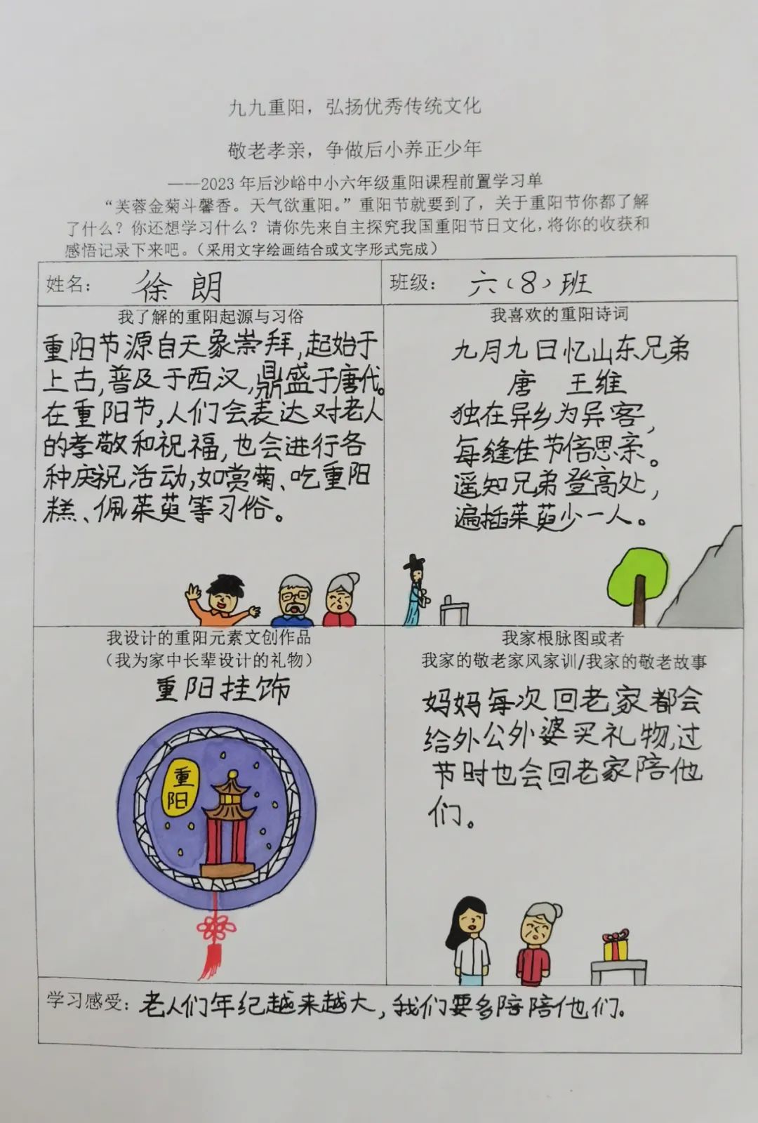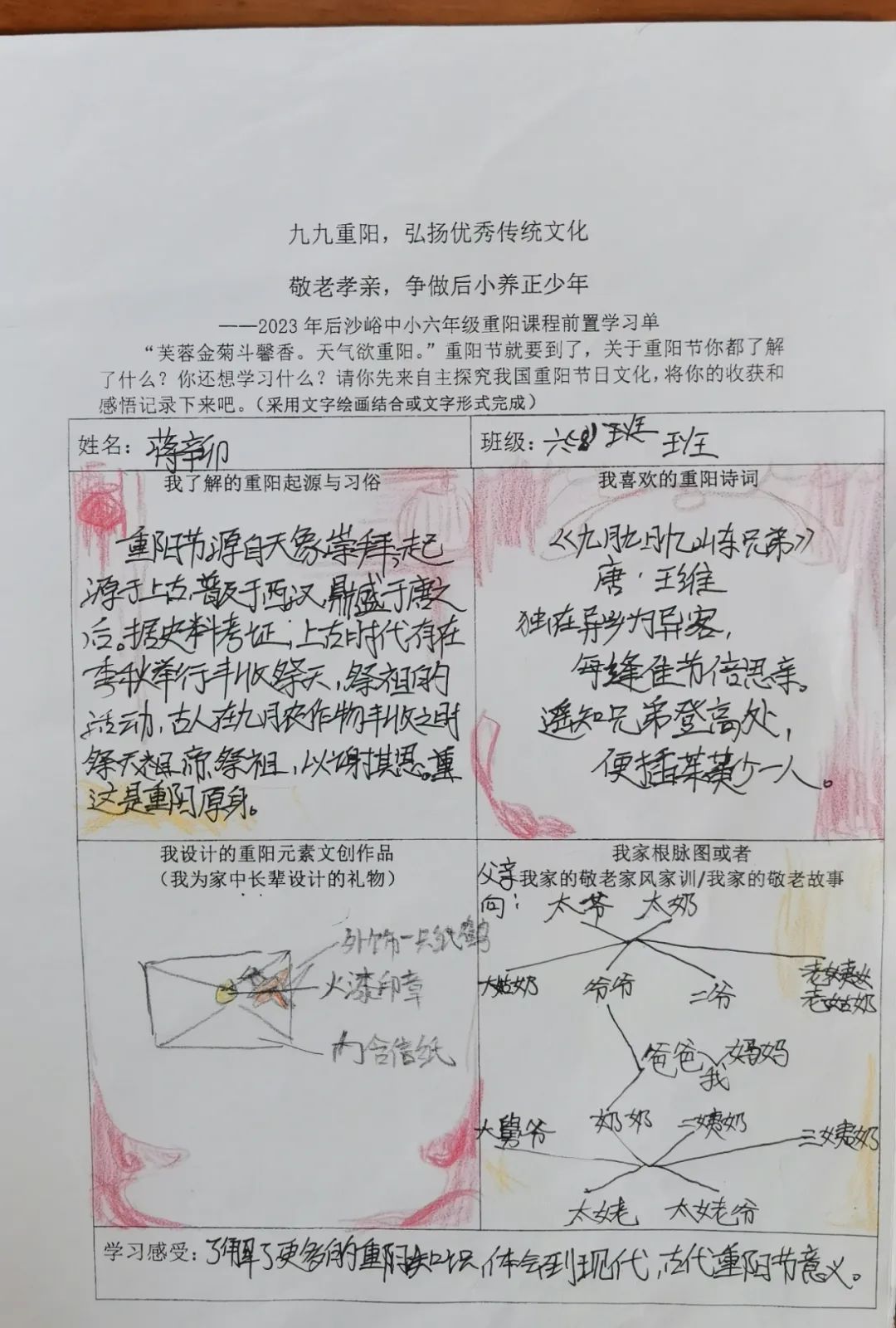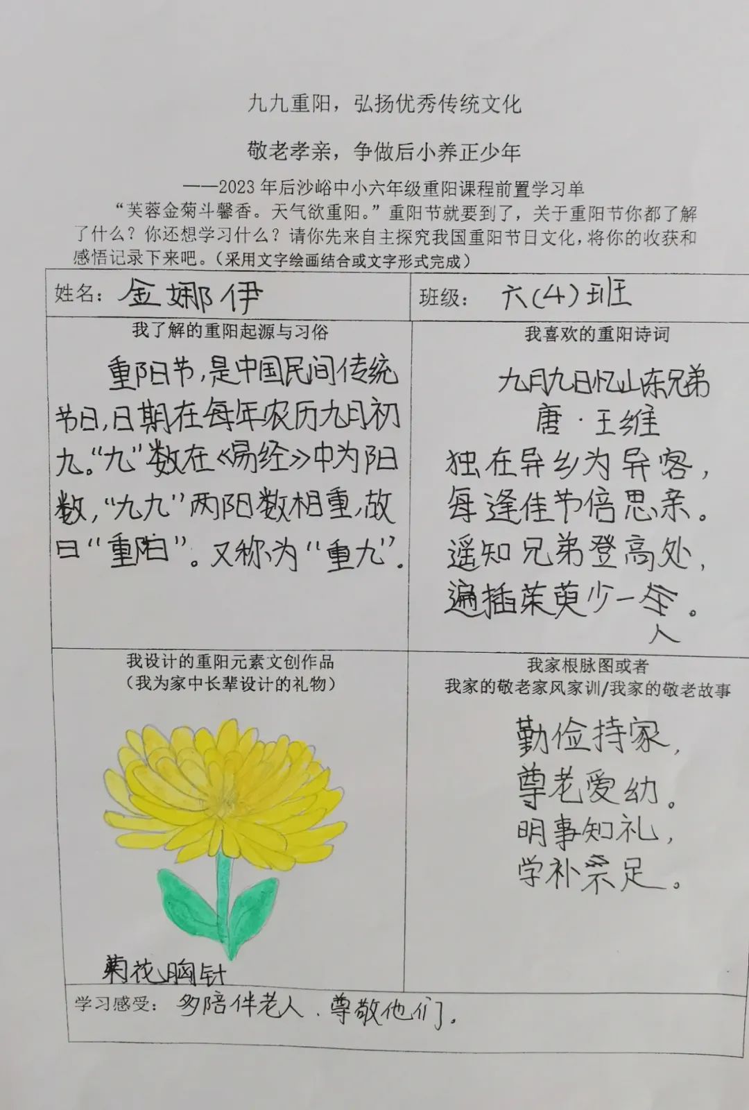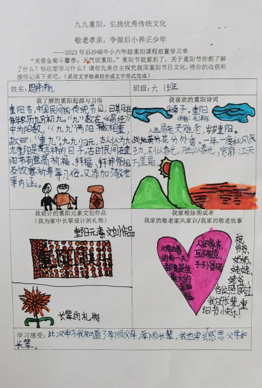 同学们开展自主学习,围绕重阳节的起源与习俗文化、重阳诗词歌赋、自家敬老家风家训和重阳元素的文创作品设计几方面进行前置学习,为重阳课程实践做好充分准备。