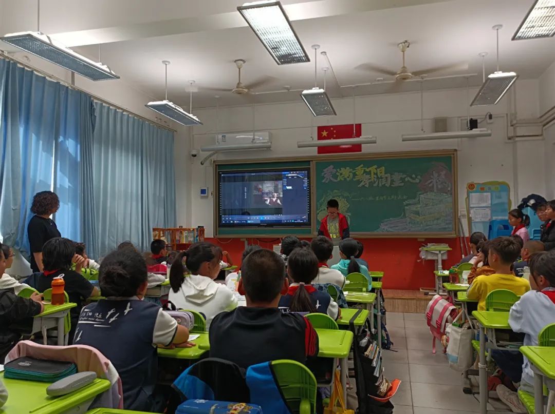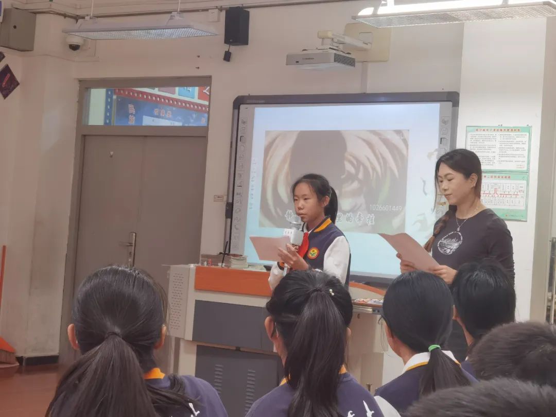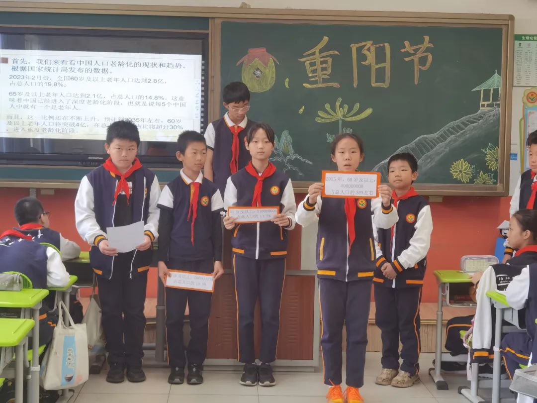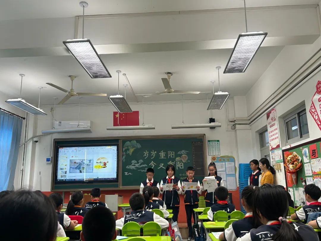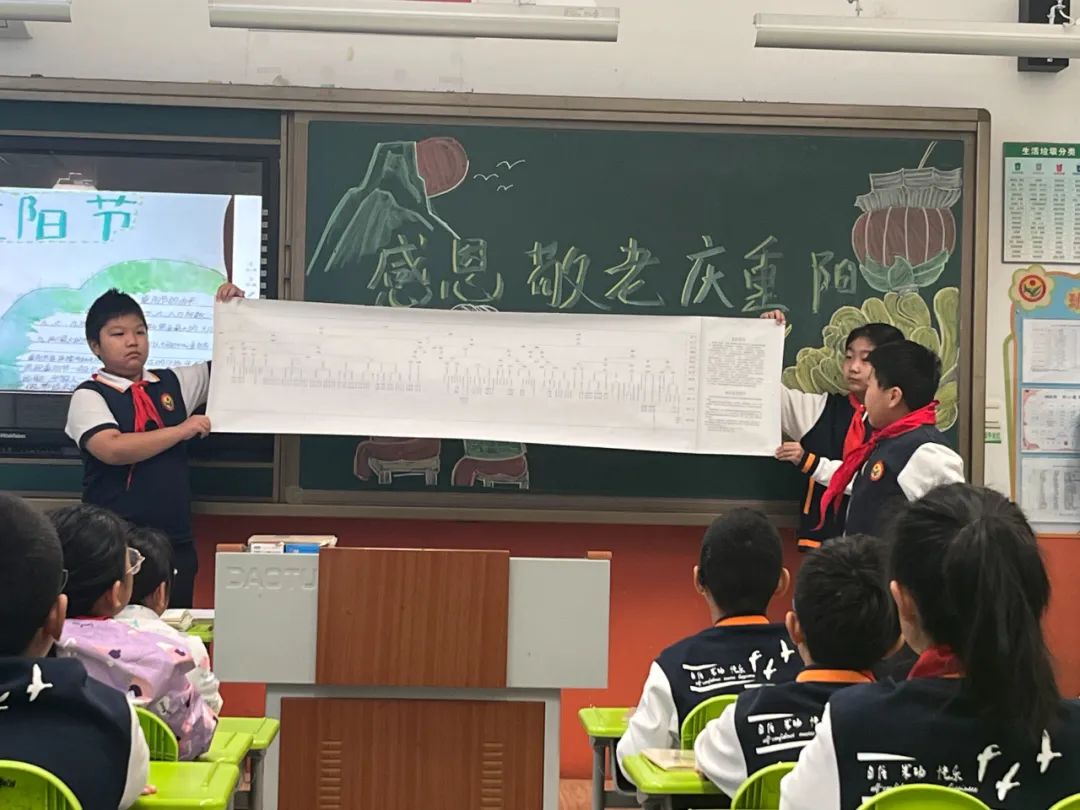 在综合实践课程中,同学们自主选择重阳文化主题内容,以小组为单位进行深入学习,并汇报展示学习收获。
