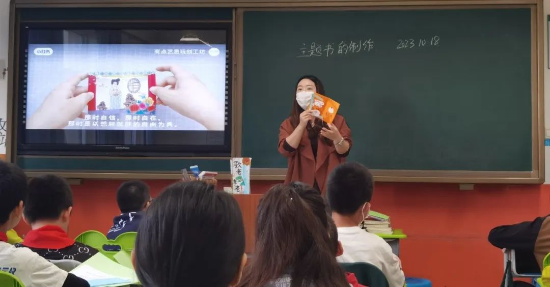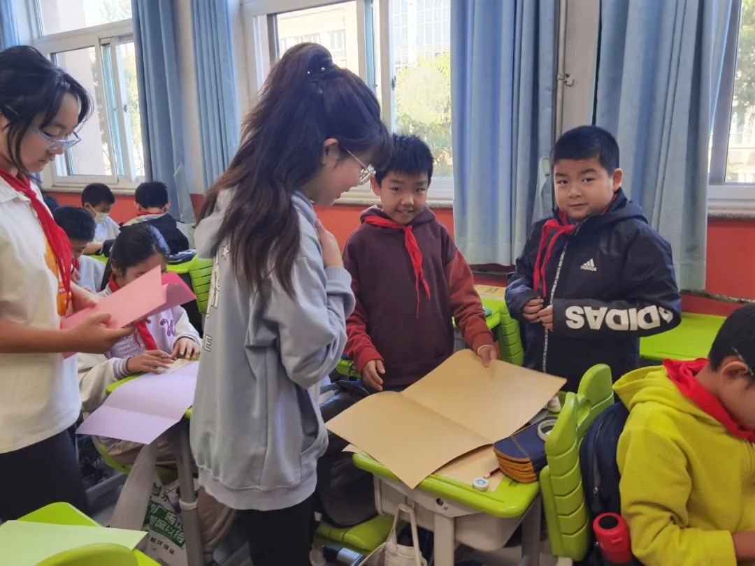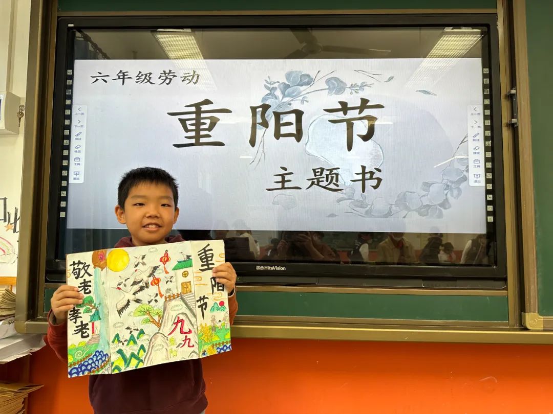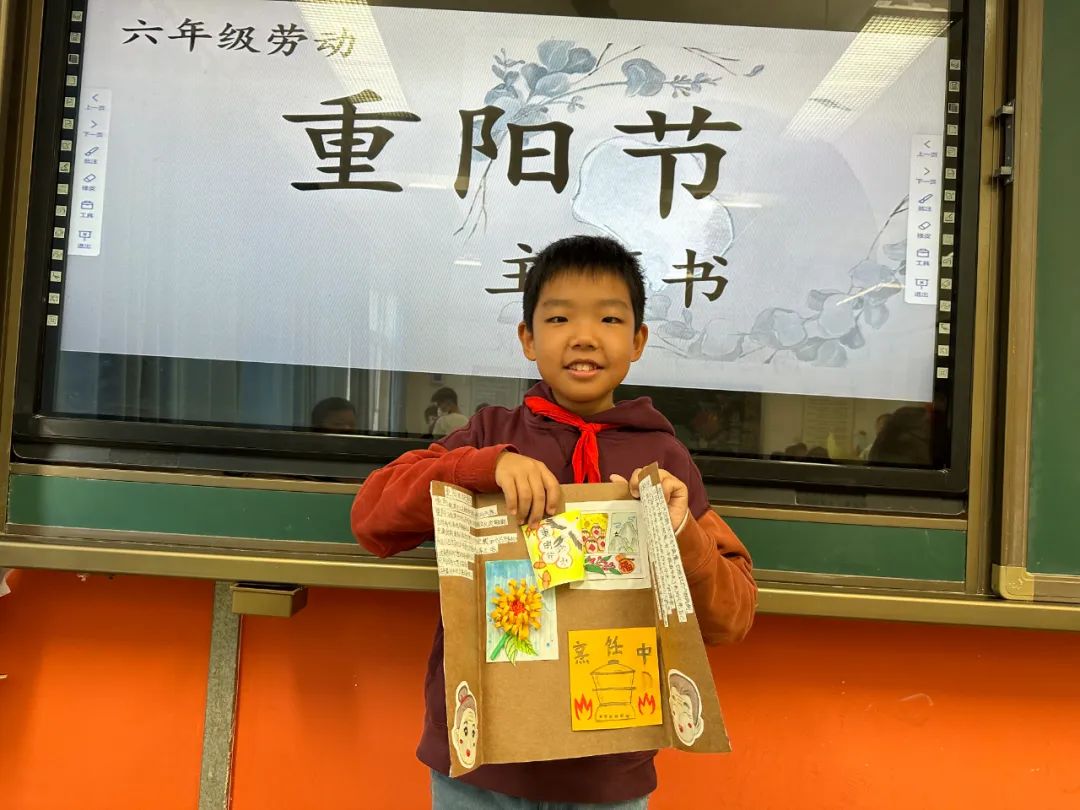 在劳动课程中,劳动教师指导学生制作“重阳”主题书,同学们将重阳课程中学习的相关文化知识进行分类梳理,设计主题书的各部分内容,在教师指导下进行制作。同学们选择折页对开或者贺卡的形式制作主题书封面,再选择自己喜欢的重阳内容用拼贴的方式粘在主题书内侧,做到图文并茂,一份份精彩的作品在他们手中呈现。